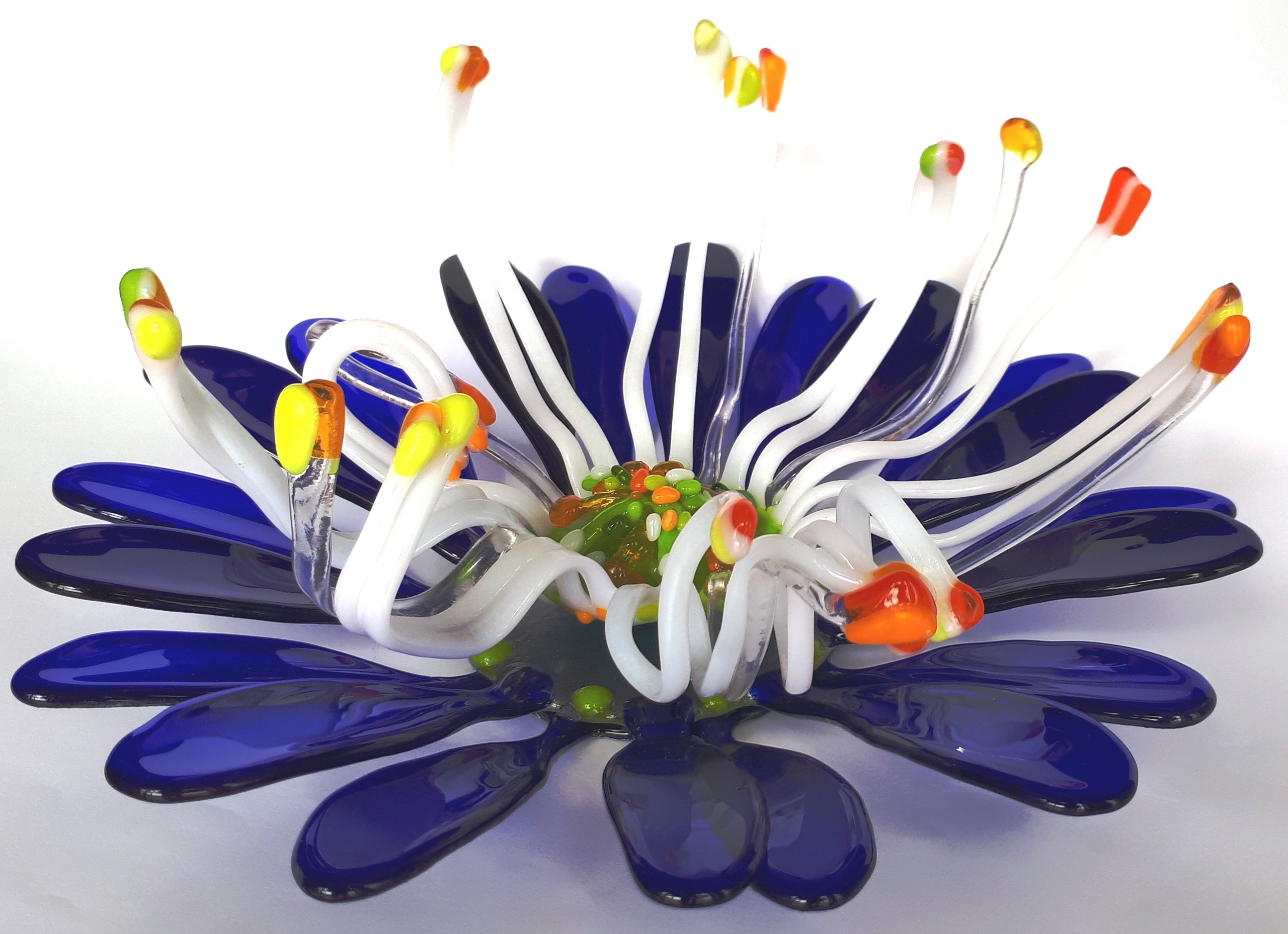Wit Oranje Geel Blauw Glaskunst Bloem Glasobject Glasfusie Glasslumping Aster Scheltema Louky Loukyscheltema