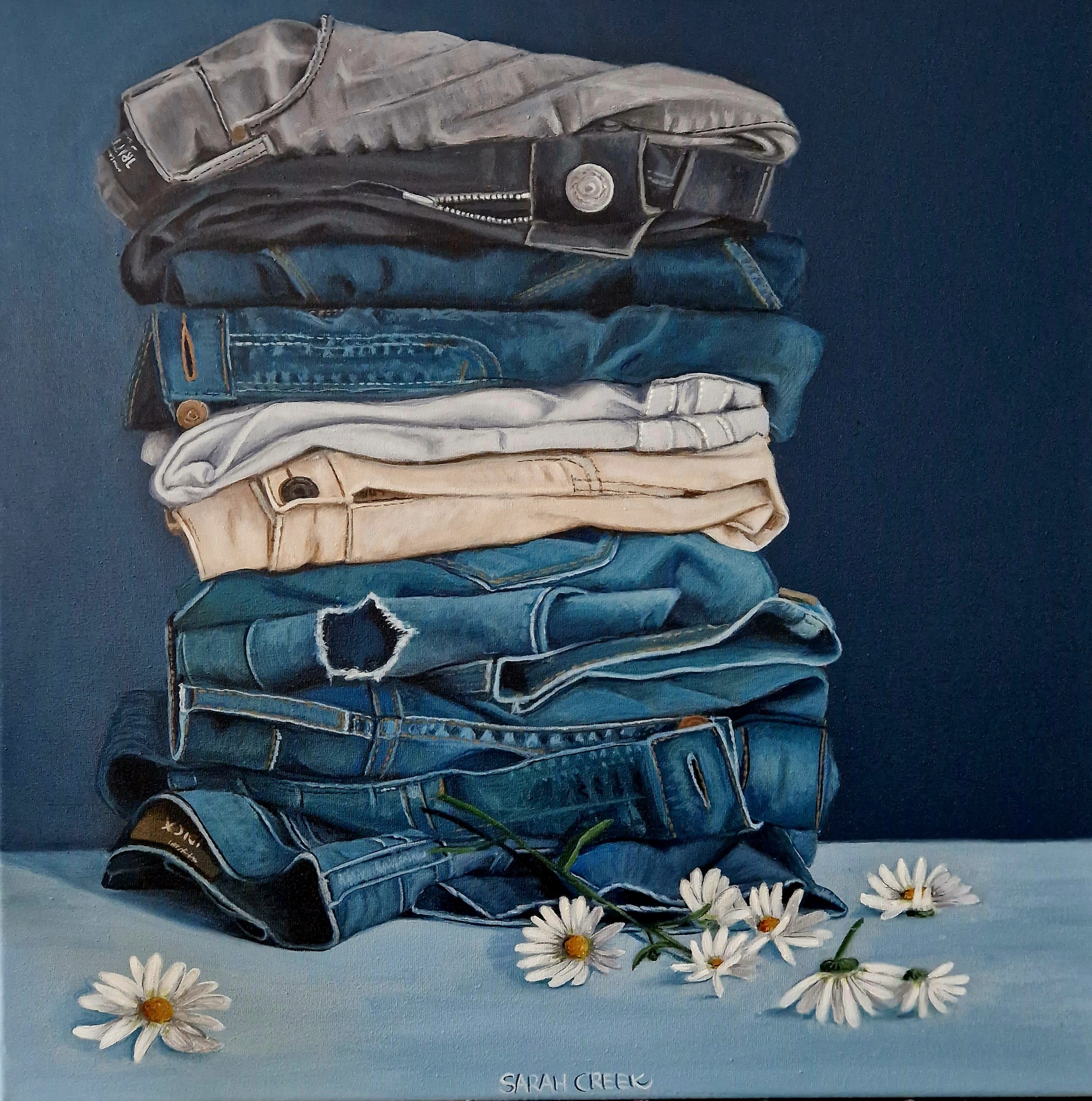 Stilleven met spijkerbroeken op 3D doek geschilderd. Met extra diepe blank houten baklijst.
