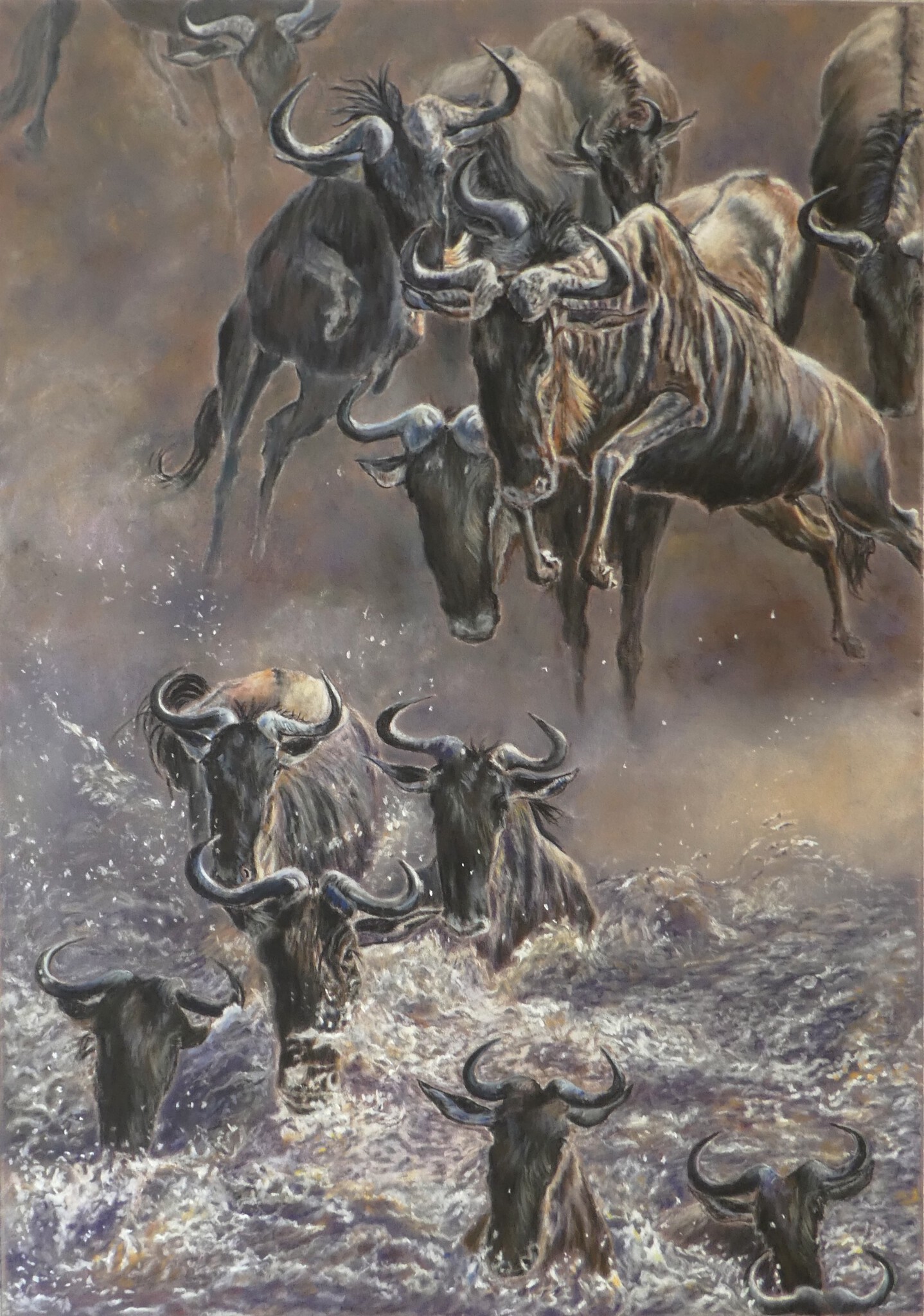 De indrukwekkende migratie van Gnoes (wildebeest). De meute denderd door, onverschrokken springen ze in de rivier waar grote gevaren op de loer liggen, maar het kan niet anders. Alleen aan de overkant zijn rijkere voedselgronden te vinden. Prijs is inclusief lijst en passe partout van 40 bij 52 cm.
