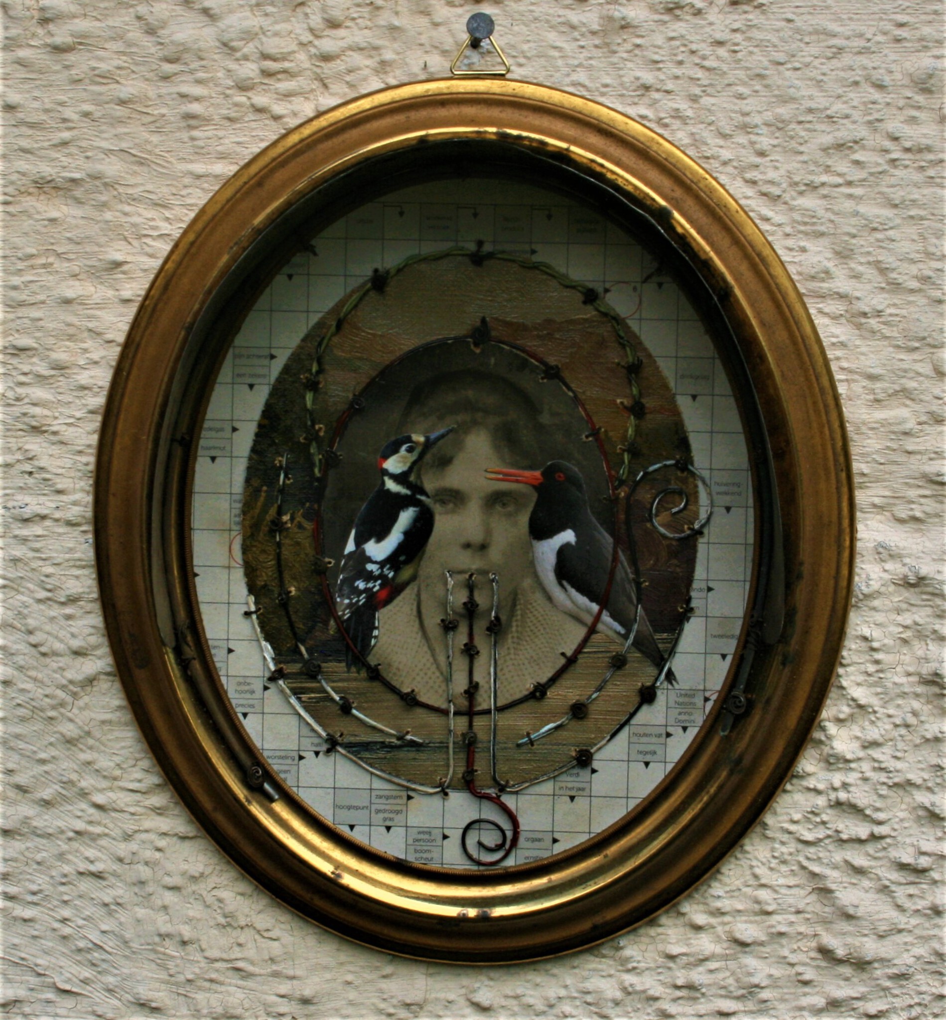 Antieke foto in originele lijst, bewerkt, ijzerdraad, acryl, collage