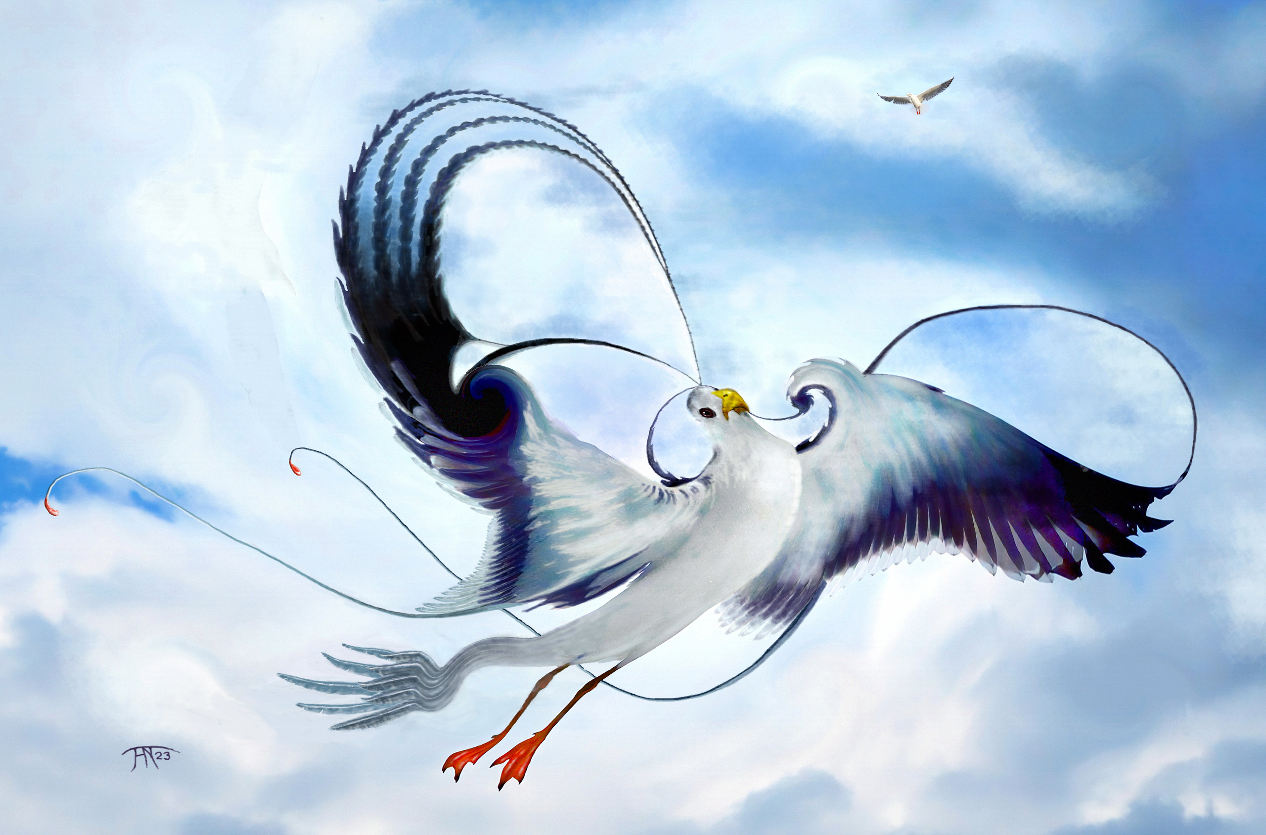 In Terschelling maakte ik een mooie foto van deze meeuw. Na wat bewerkingen met brushtechniek liet ik de meeuw zijn feestje vieren. Ik hoop dat de toeschouwer vrolijk wordt van dit werkje.