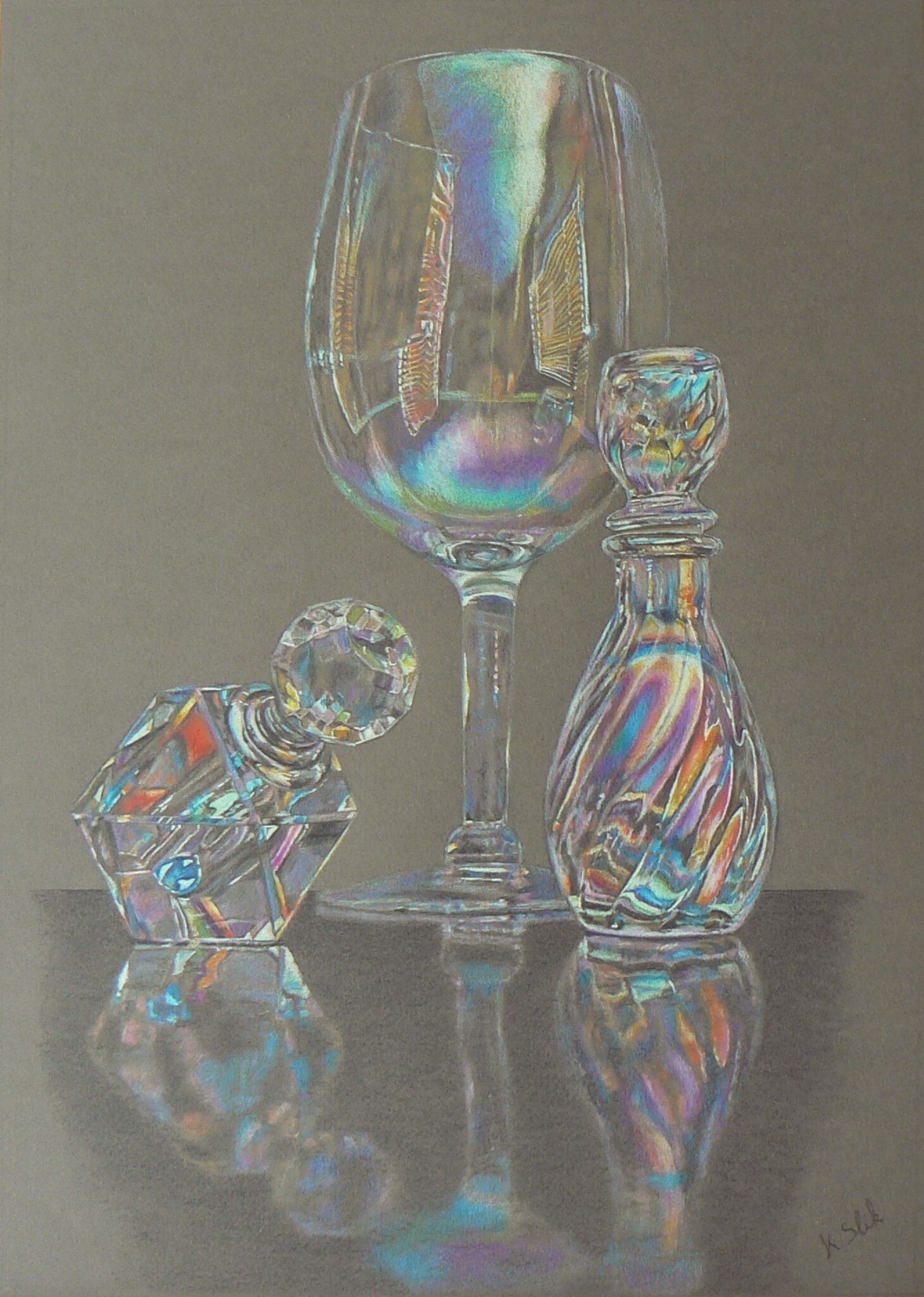 Voor dit werk kreeg ik in 2019 een nominatie in de landelijke wedstrijd , "tekening van het jaar 2019". De reflectie van licht boeit me altijd. En in dit werk breekt het licht in allerlei kleuren in de verschillende glazen.