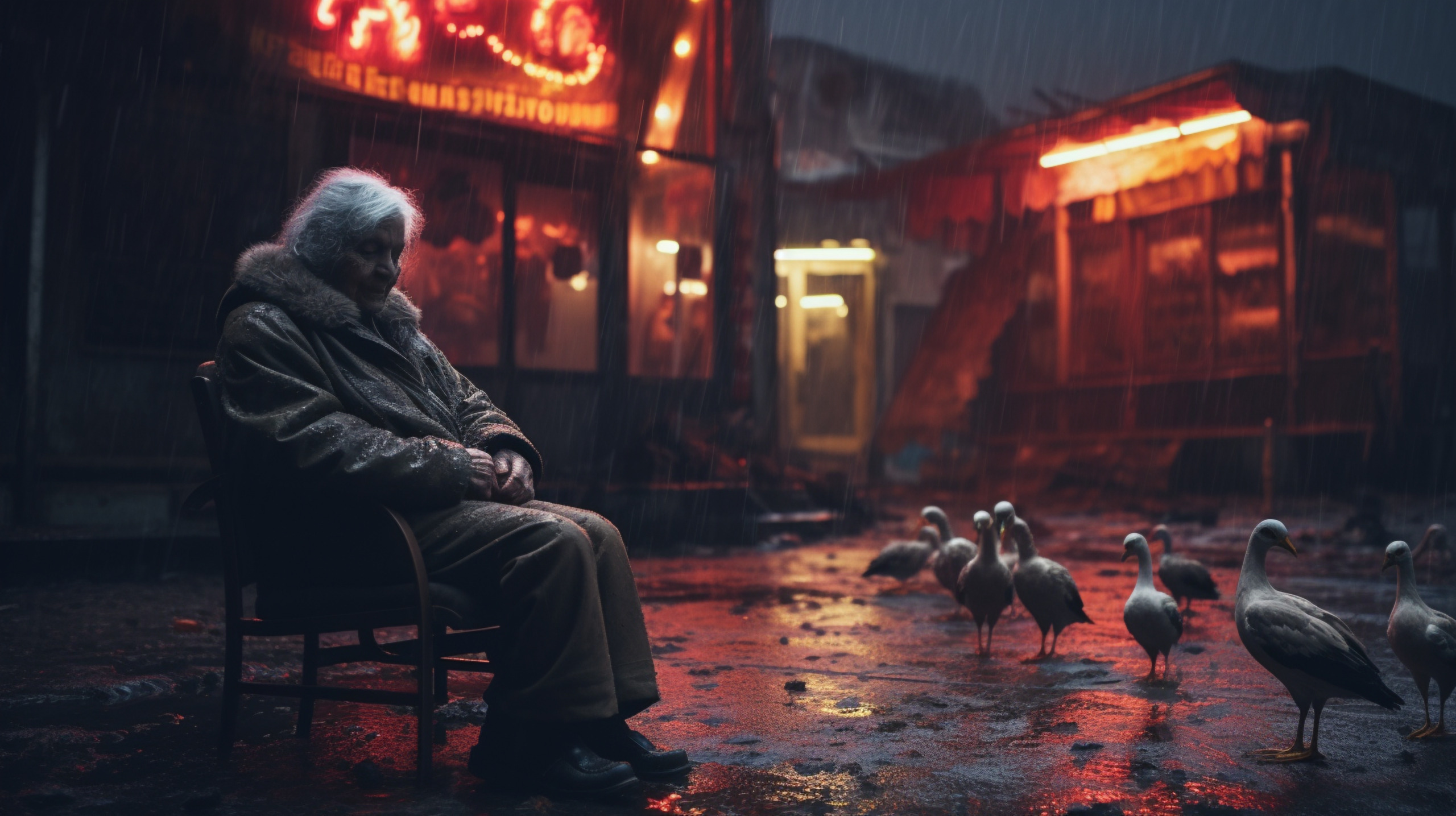 Remnants of joy and laughter are overshadowed by an atmosphere of desolation. Amidst the decaying rides and rusting games, an elderly woman sits, her presence an enigma. A congregation of birds gathers at her feet, their purpose unclear, as if awaiting a sign or a command. The ancient lights of the attractions, against all odds, still burn, casting a haunting red glow over the scene, hinting at memories long forgotten and futures uncertain