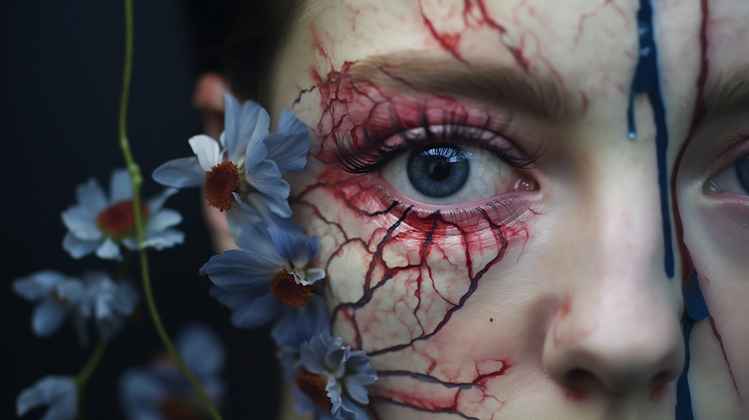 In the midst of shadows, a woman emerges as a beacon of transition. Delicate blue flowers, almost ghostly in their hue, sprout from her skin, intertwining with her very being. Yet, the stark crimson that pools around her intense blue eyes speaks of deeper sorrows and untold stories. She stands at the crossroads of beauty and pain, nature and decay, marking a threshold between what once was and the mysteries that lie ahead.