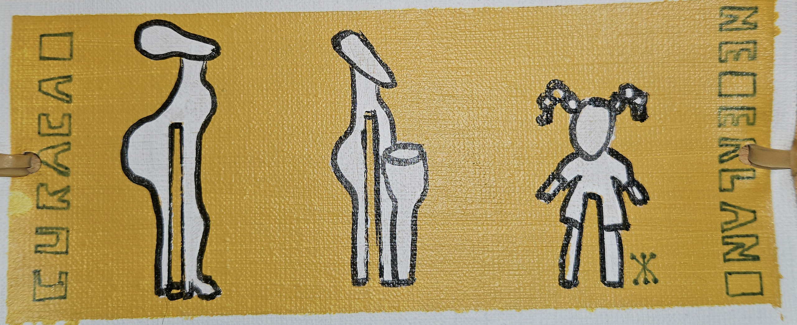 Project “Pakje Kunst” - Corona Faces - mixed media on linen in different colors with elastic bands - 9x6cm – 2023. Only for sale for 4 euro in vending machines at Museum Schiedam in Schiedam.