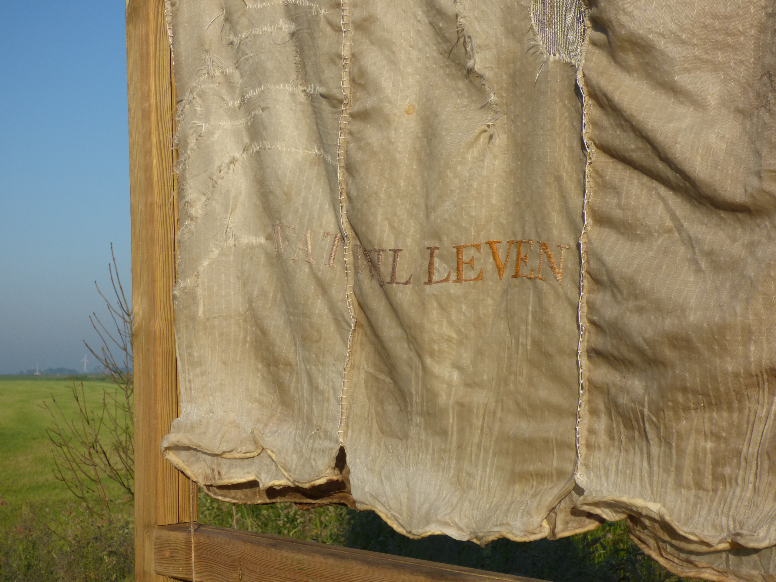 installatie gemaakt van oude zandzakken, gebruikt als dijkbescherming, deze installatie was te zien tijdens de Kunst Kuier 2021 in Pingjum hersteld, versteld, geheeld en verbonden - WAT WIL LEVEN -