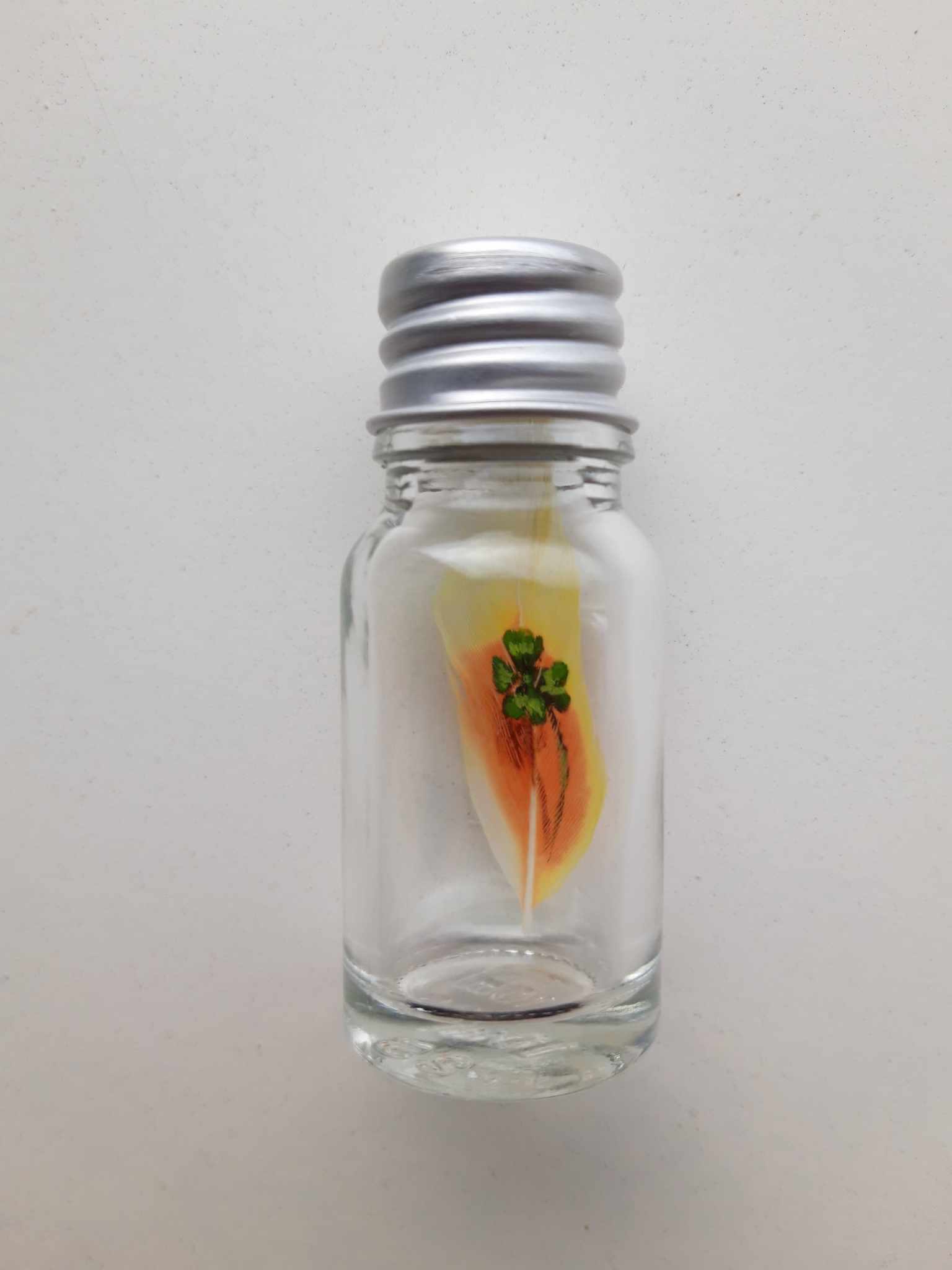 Collectie "Message in a bottle" Ieder flesje heeft een beschilderd mini veer met een afbeelding die een positieve boodschap brengt. -Lieveheersbeestje = doorzettingsvermogen. -Klavertjevier = geluk. -Madeliefje = ultieme liefde. -Vlinder = Creativiteit en de eigenschap van "van iets negatiefs , iets positiefs maken". De kleur van de veren kan varieren. Afmeting van de glazenfles is c.a. 2cm diameter en 6cm hoog. Prijs €6 per stuk. Verzending van 1 flesje kost €5,25 als brievenbus pakket met track and trace binnen Nederland. Verzending van meerdere flesjes kost € 8,25 met track and trace binnen Nederland. *De veren kunnen anders eruitzien met betreft tot de kleuren en vormen. Iedere veer is uniek.