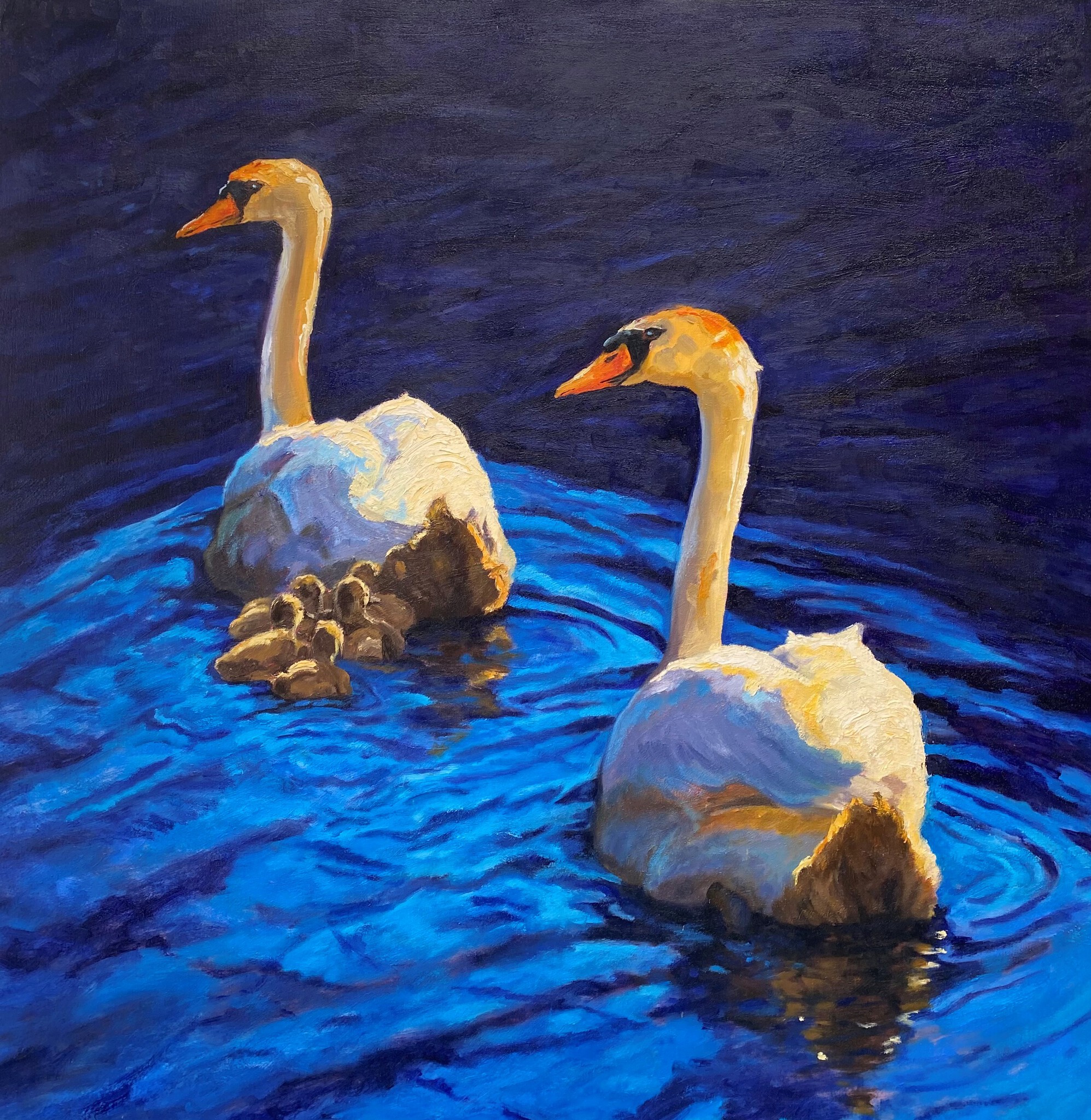 Schilderij Geel Blauw Dieren Water Licht Zwanen Liefde Ouders Olieverf Painter Natuur Moeder Jongen Kinderen Sloot Vader Thuis Veilig Home Geborgen Family Swans Lichtwerker Marloesbuigelboering
