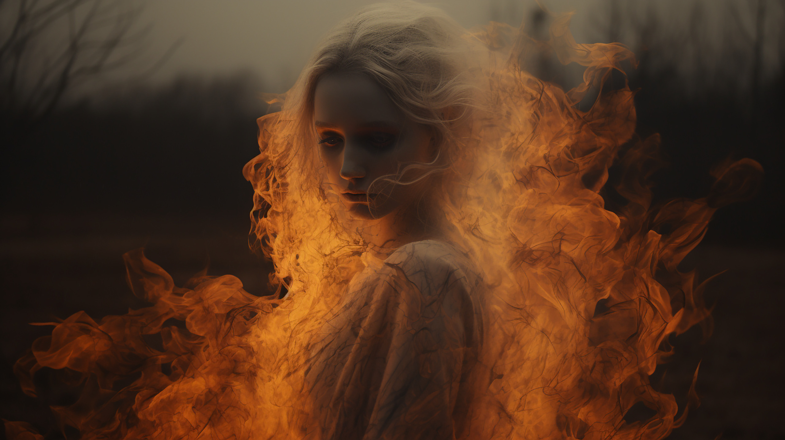 In the midst of a tempestuous dance of light and shadow, a blonde woman stands, her long tresses flowing seamlessly into a cascade of flames. As the fire engulfs her, it doesn't consume but rather becomes an extension of her very being. The flames, wild and untamed, wrap around her form, creating a mesmerizing spectacle of power and beauty. Her eyes, fierce and unyielding, reflect the inferno that surrounds her, embodying a spirit that is both indomitable and ethereal.