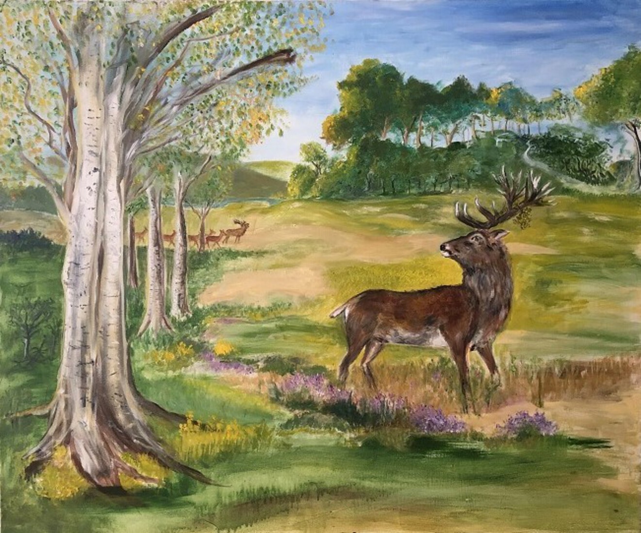 Het hert op de voorgrond ziet een roedel hinden met plaatshert uit de dekking komen.