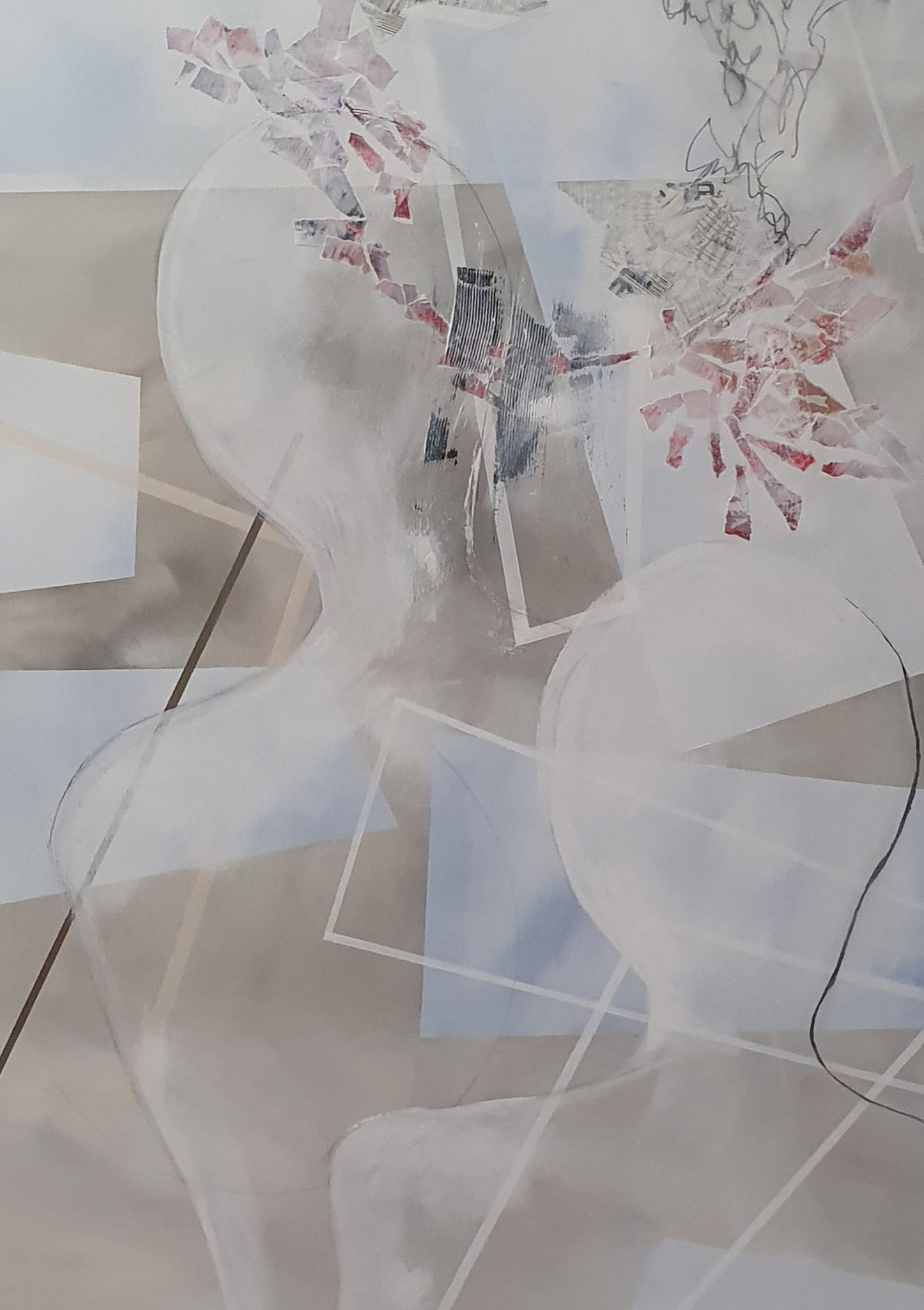 Onze geest absorbeert prikkels en weert ze af. In dit schilderij zie je een conflict tussen het afweren en opnemen. Er is gebruik gemaakt van acrylverf, papier en houtskool.
