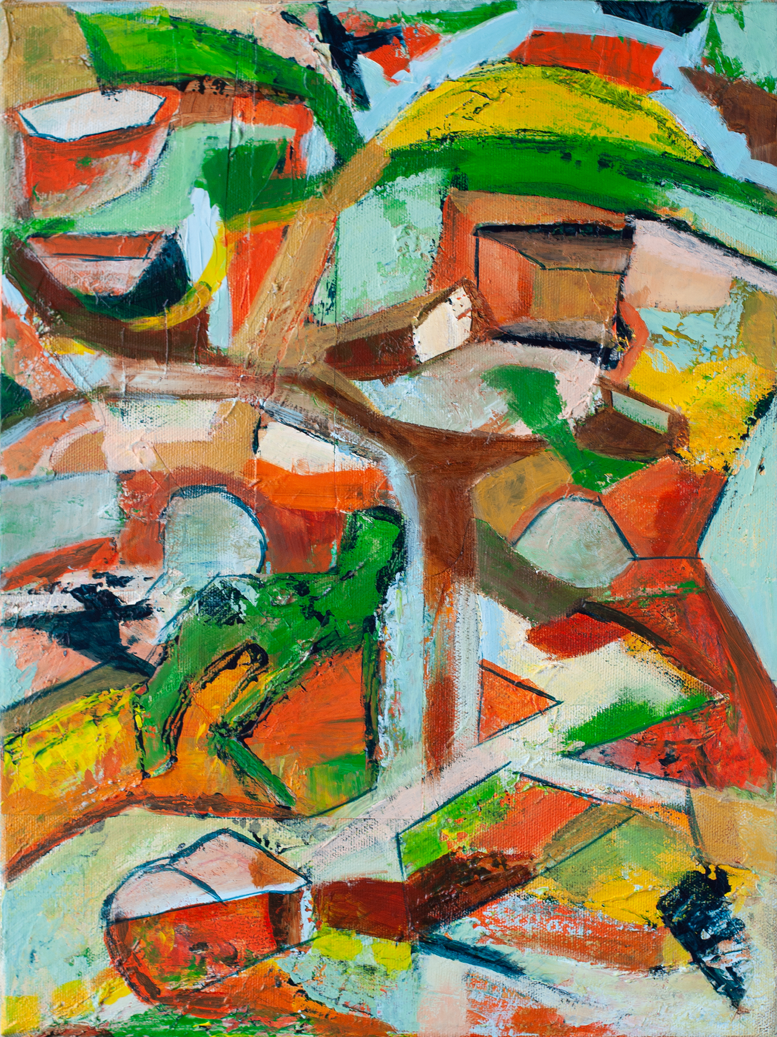 Terwijl ik lijnen, vormen en kleuren schilder, ontdek ik wat voor schilderij ik maak. Ik werk het uit en dit verhaal is het resultaat.