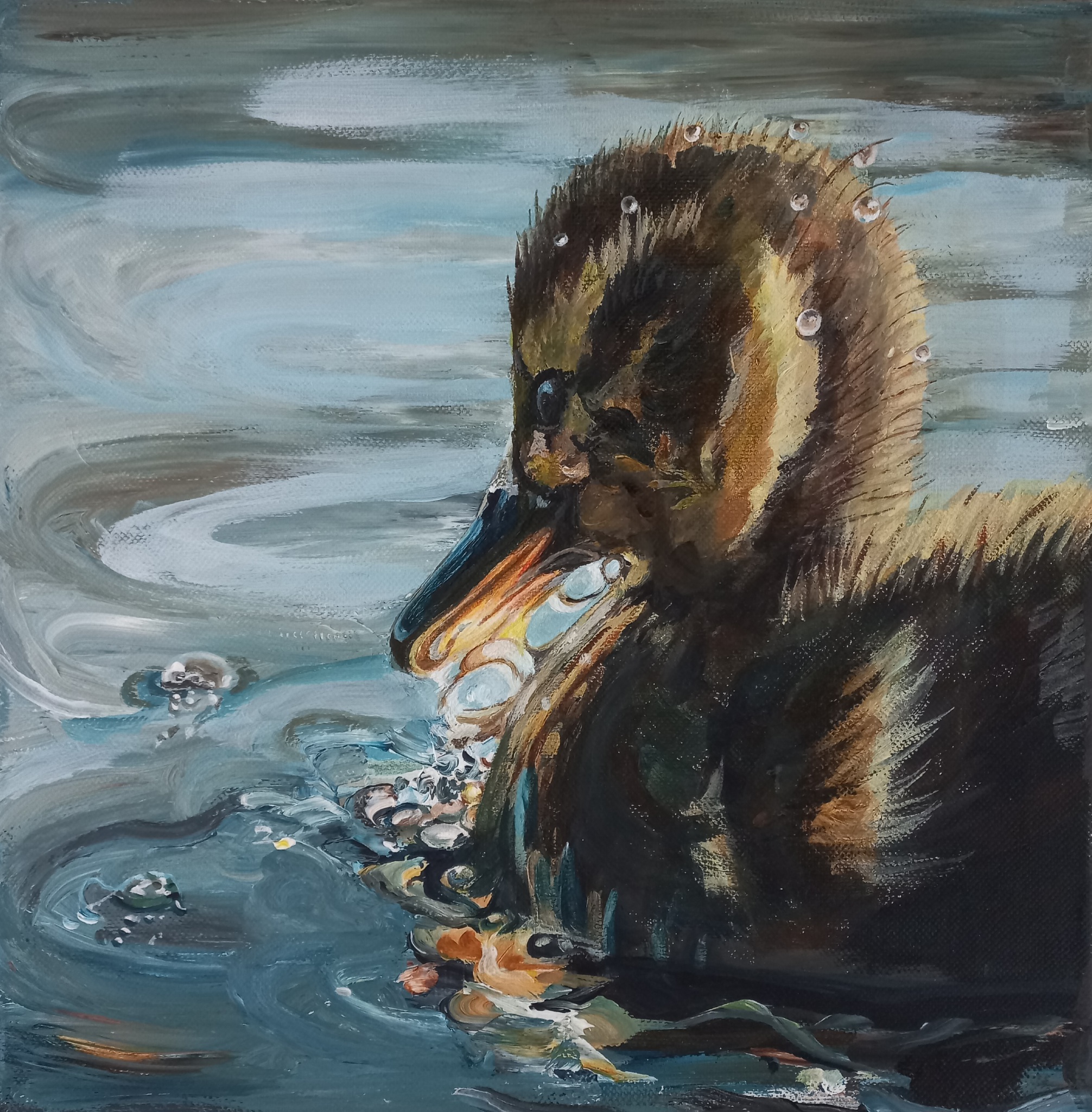 De uitdaging in dit schilderij zijn de belletjes onder zijn snavel en de druppels in zijn veertjes.