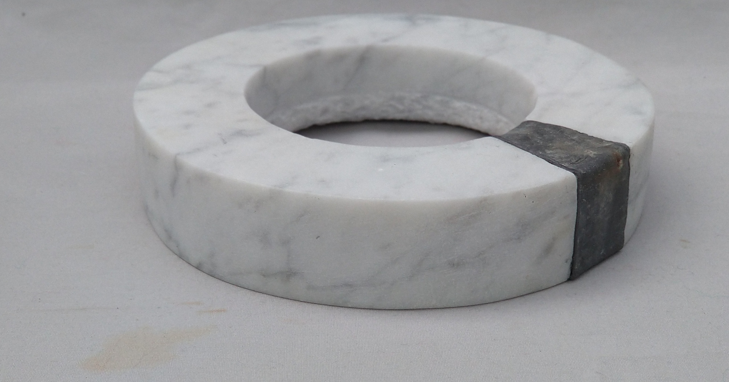 Marmer bewerken is zwaar- en de verbinding heb ik met lood gemaakt. De kleur past heel mooi bij de aders. Als je de bewerkte kant van de cirkel naar beneden legt lijkt het van binnen een beetje te zweven- als tegenwicht tegen de zwaarte van het werk.