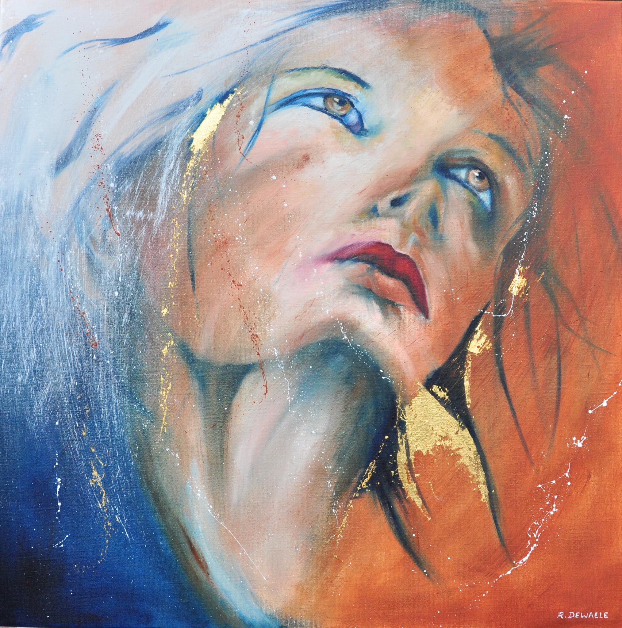 Het werk is geschilderd in hoogwaardige kleurvaste olieverf op linnen canvas en er is gebruik gemaakt van fragmenten bladgoud 22 kt. Het geheel is afgewerkt met een hoogwaardige vernislaag speciaal bedoeld voor schilderijen ter bescherming tegen vuil. The work is painted in high-quality, colourfast oil paint on linen canvas and fragments of 22 kt gold leaf have been used. The whole is finished with a high-quality varnish layer specially intended for paintings to protect against dirt.