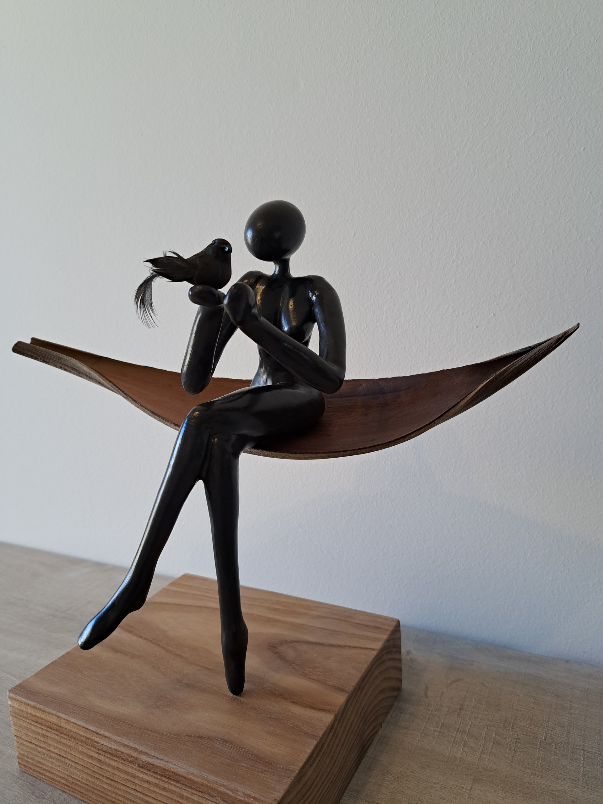 Met vogeltje op de hand en op voetstuk van Jatobahout. Is verkocht maar op verzoek te maken.