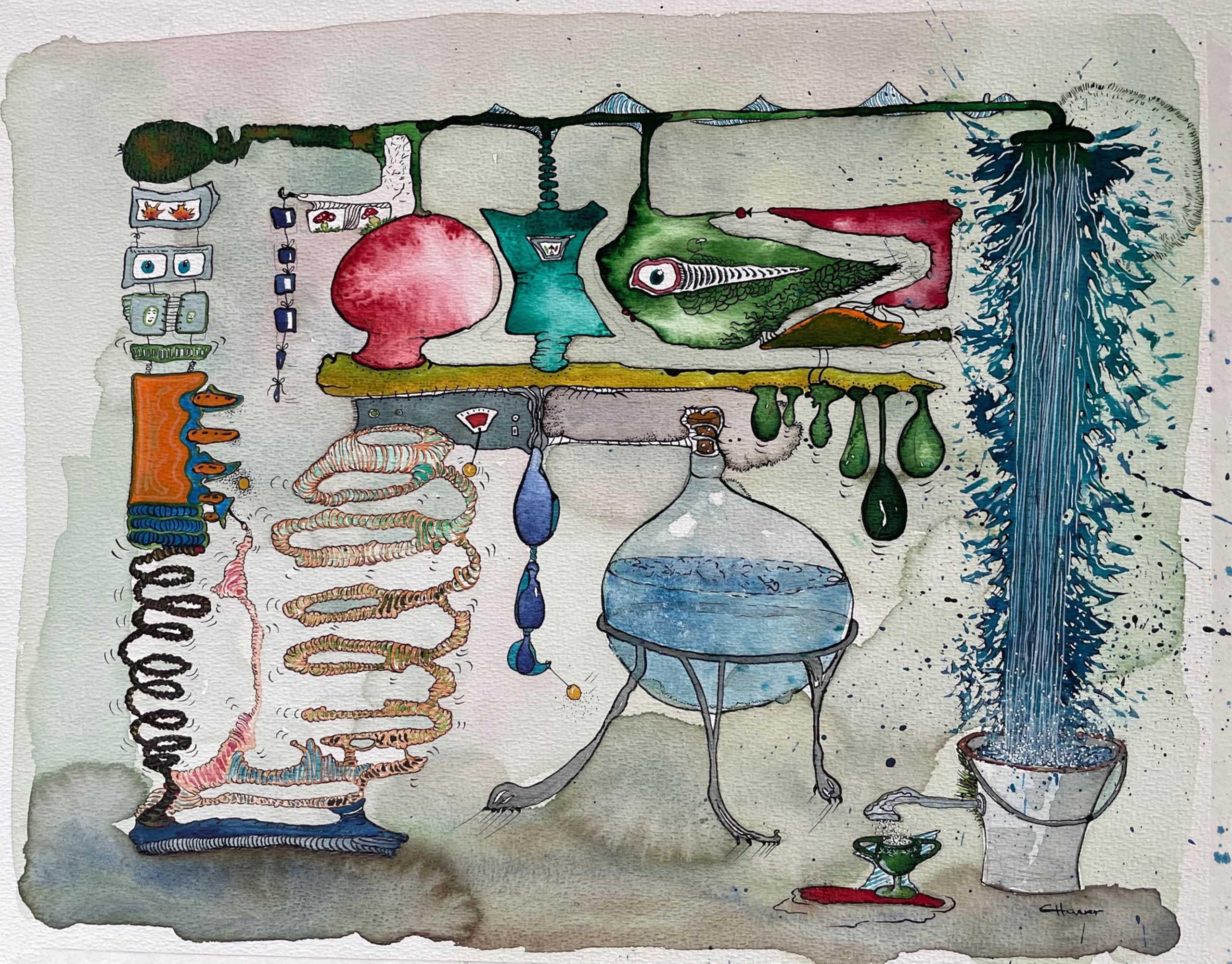 Machine die samenwerkt met vis, paddestoelen en diverse andere middelen om via een douche het kopje te vullen.