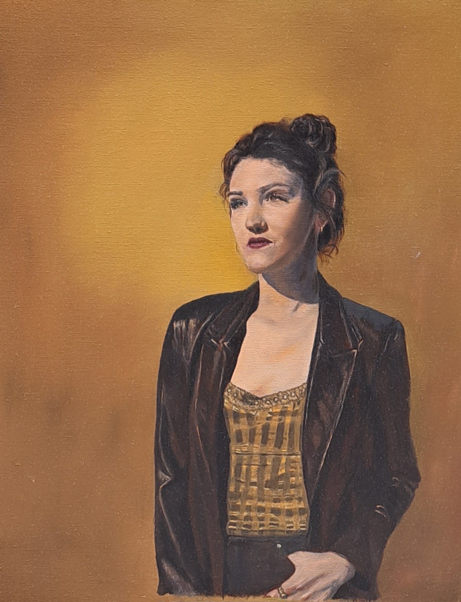 Jonge vrouw peinzend voor zich uit kijkend. 40x50 olieverf op doek
