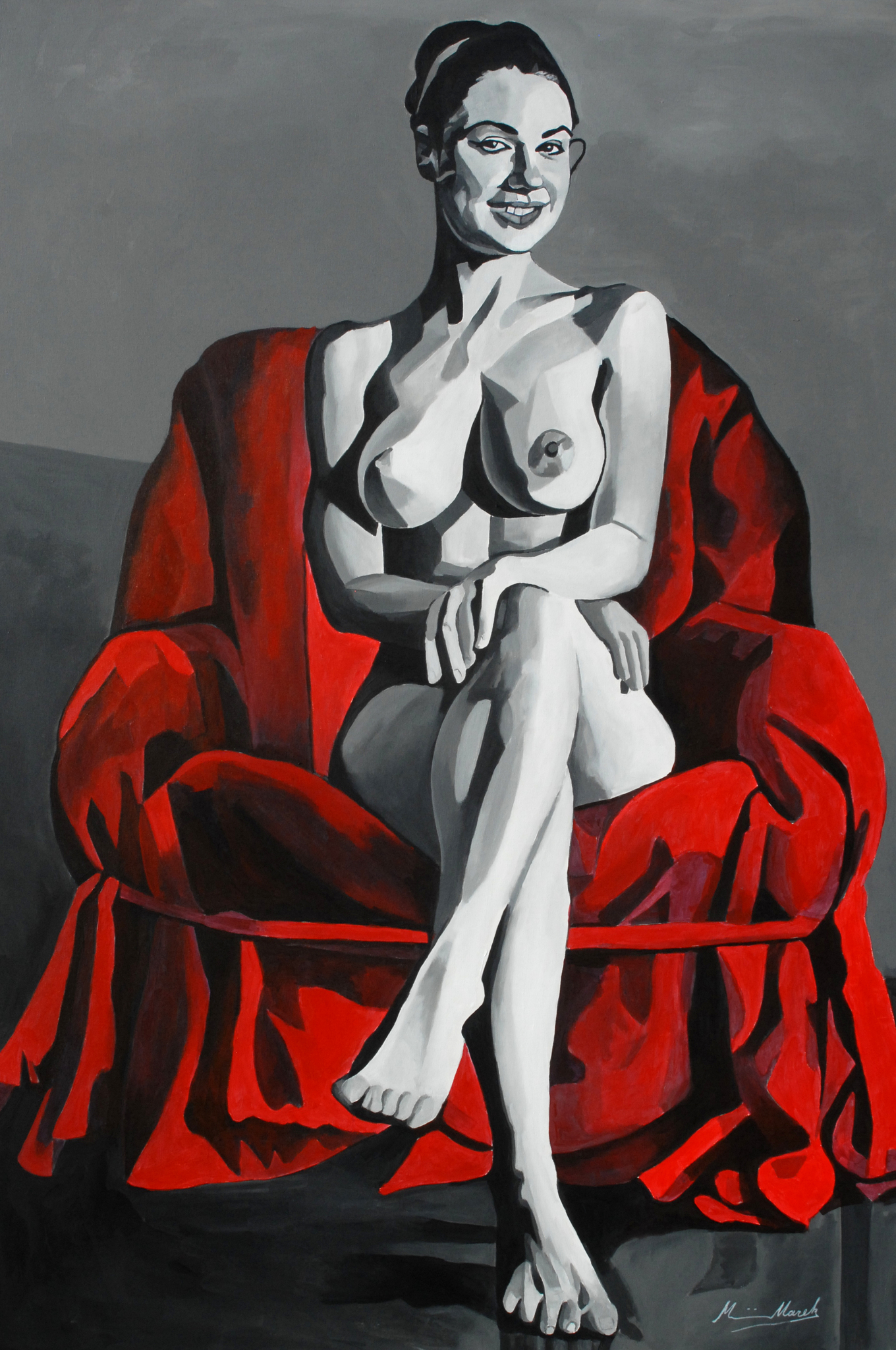 Dit werk is deels live geschilderd op het kasteel van De Renesse in Oostmalle. Ik heb de vrouw geschilderd als een krachtig en zelfzeker persoon. Volledig in het zwart-wit om het karakter van de vrouw te benadrukken. De enige kleur die ik gebruikt heb, is rood. Rood in zijn puurste vorm, voor de zetel. Zowel het personage, als de zetel zijn geabstraheerd in geometrisch afgebakende vormen die licht en schaduw weergeven.