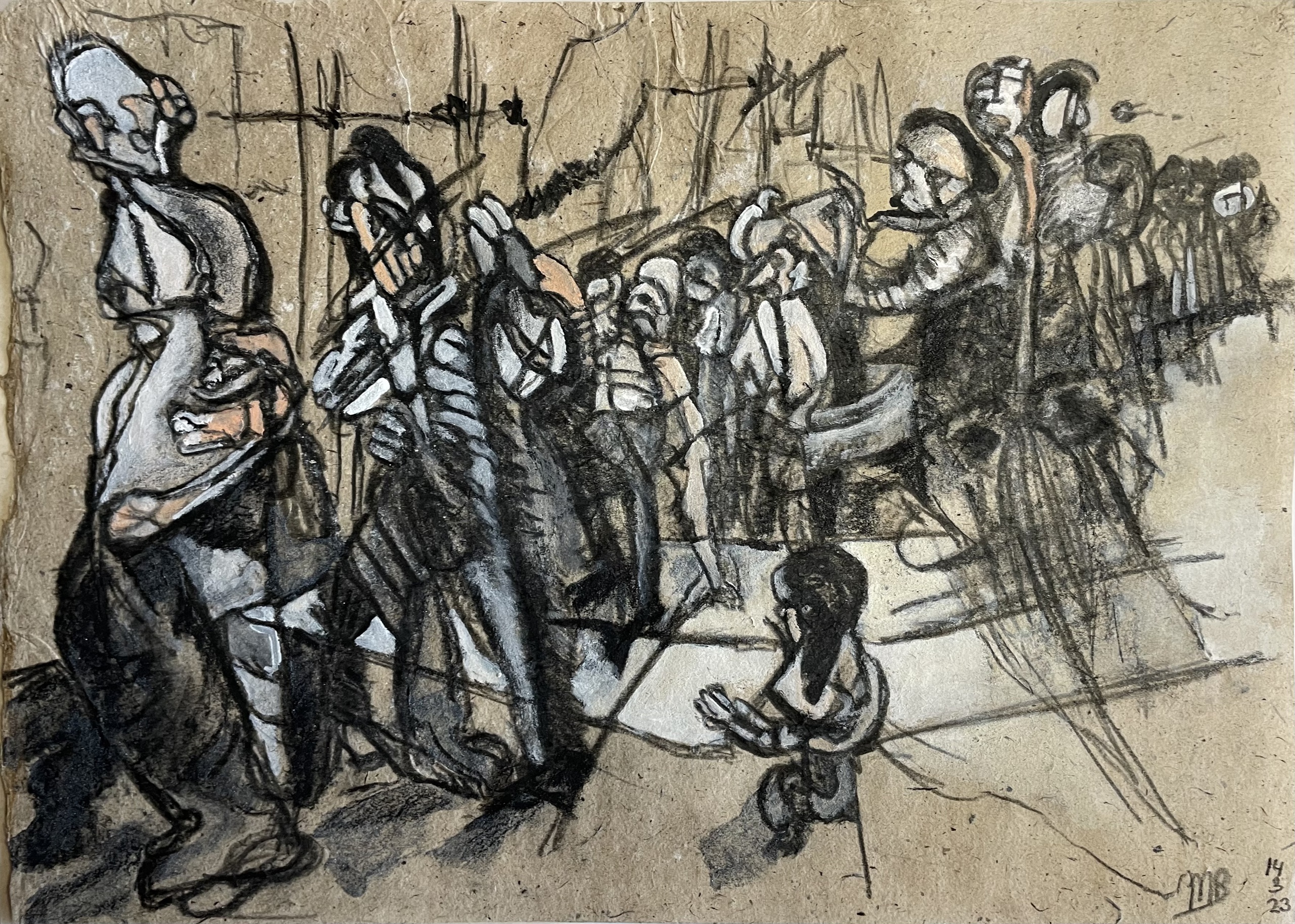 Mixed Media Papier Tekening Crowdscape