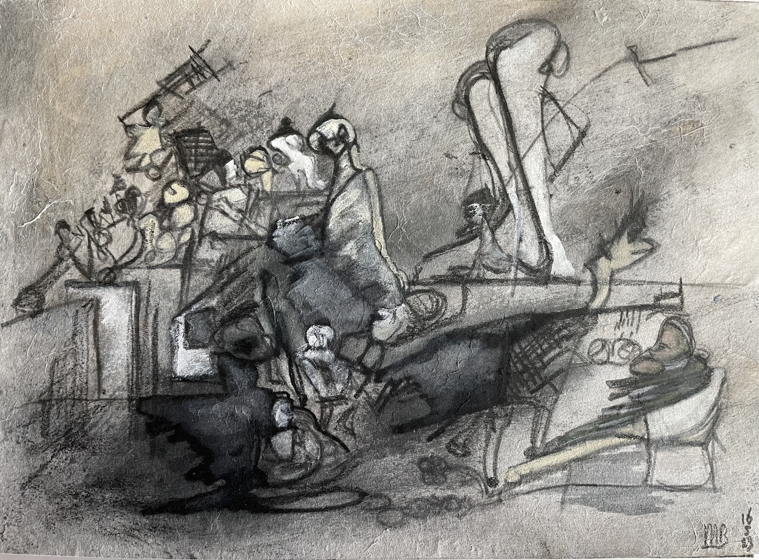 Mixed Media Papier Tekening Crowdscape