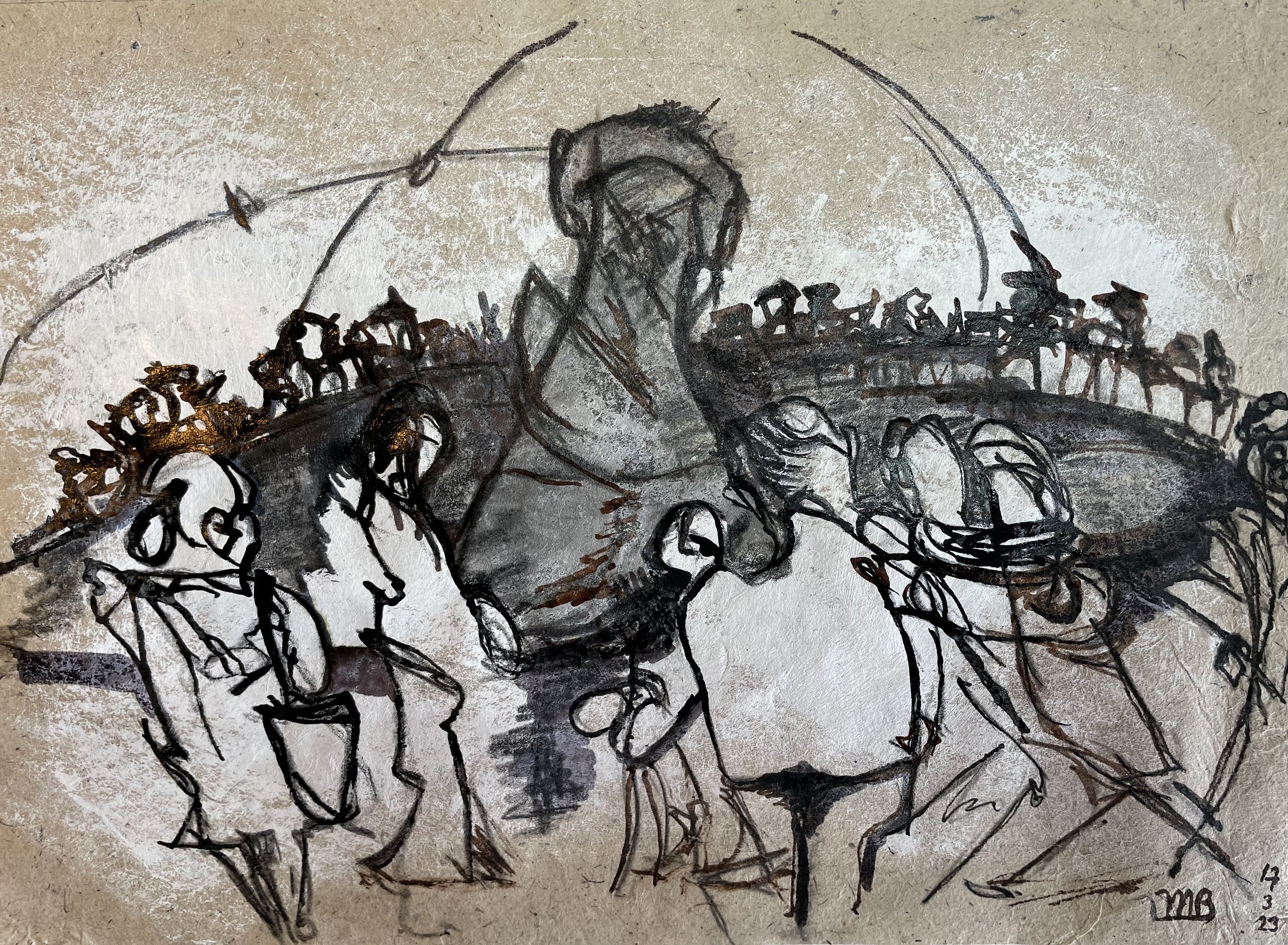 Mixed Media Papier Tekening Crowdscape