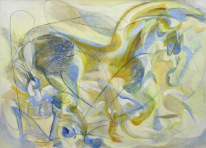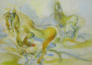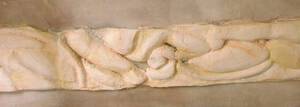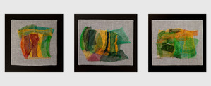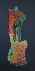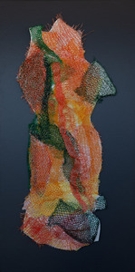 Linker paneel van het tweeluik: In vuur en vlam. In het improvisatie stadium van het grote werkstuk de waaier: "In vuur en vlam" zijn een aantal stukken ontstaan die ik niet bleek te kunnen gebruiken. Een in het platte vlak ontworpen beeld wordt in een zig-zag gedeeltelijk aan het zicht onttrokken. Door ze naderhand op panelen te maken zijn het nu autonome reliëfs geworden. Wel inspiraties op het thema "In vuur en vlam"