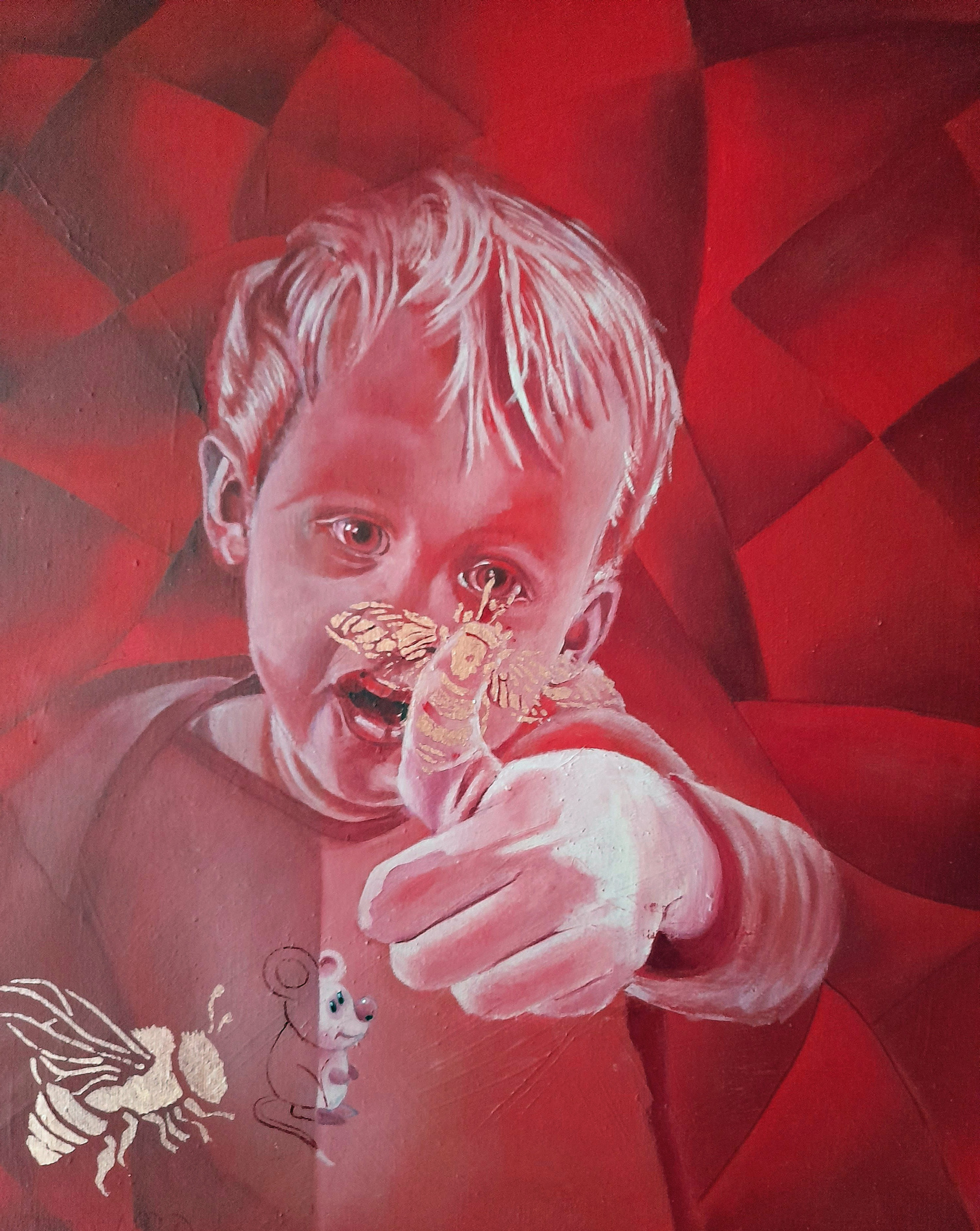 mijn kleinzoon in olieverf met driekleuren rood bordeaux en buff titaan