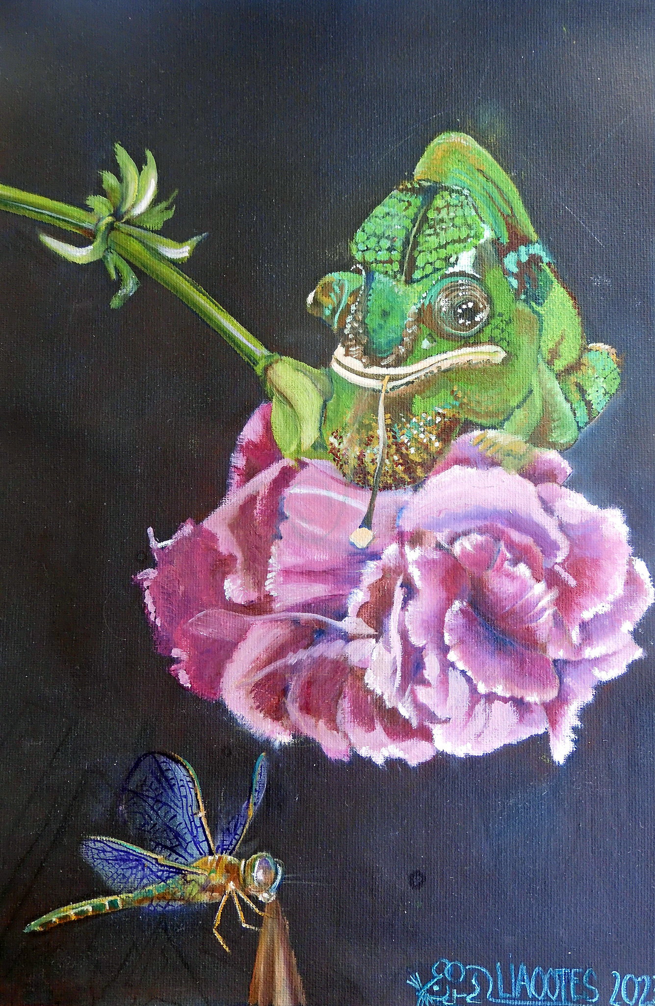een kameleon een bloem en een libel een gekke combinatie maar wel mooi zo samen