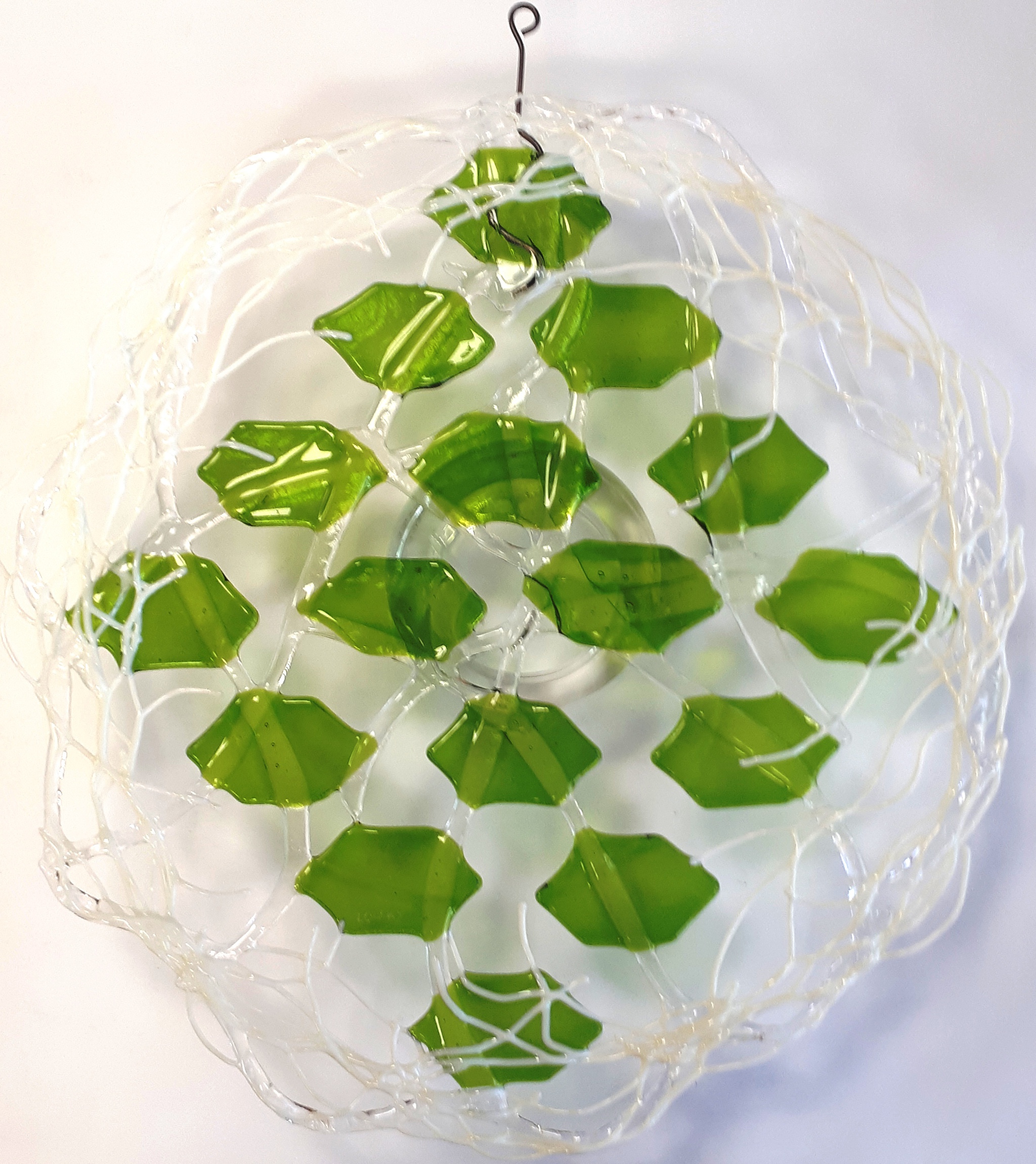 Geabstraheerde versie van een korstmos onder een vergrootglas. Hier uitgevoerd in Bullseyeglas met ophanghaak.