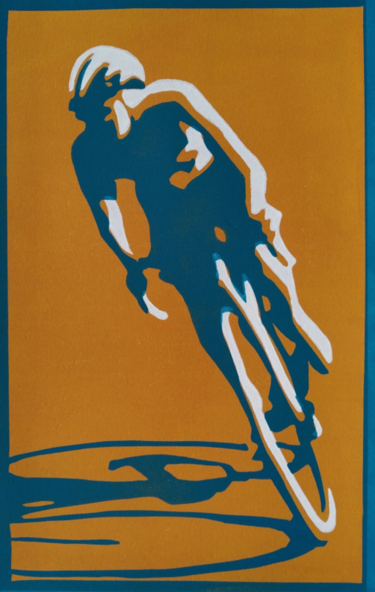 De wielrenner Tadej Pogacar in een bocht. Ik heb van deze prent verschillende kleuren gedrukt. Het is een oplage van 16, maar eigenlijk zijn ze allemaal uniek.