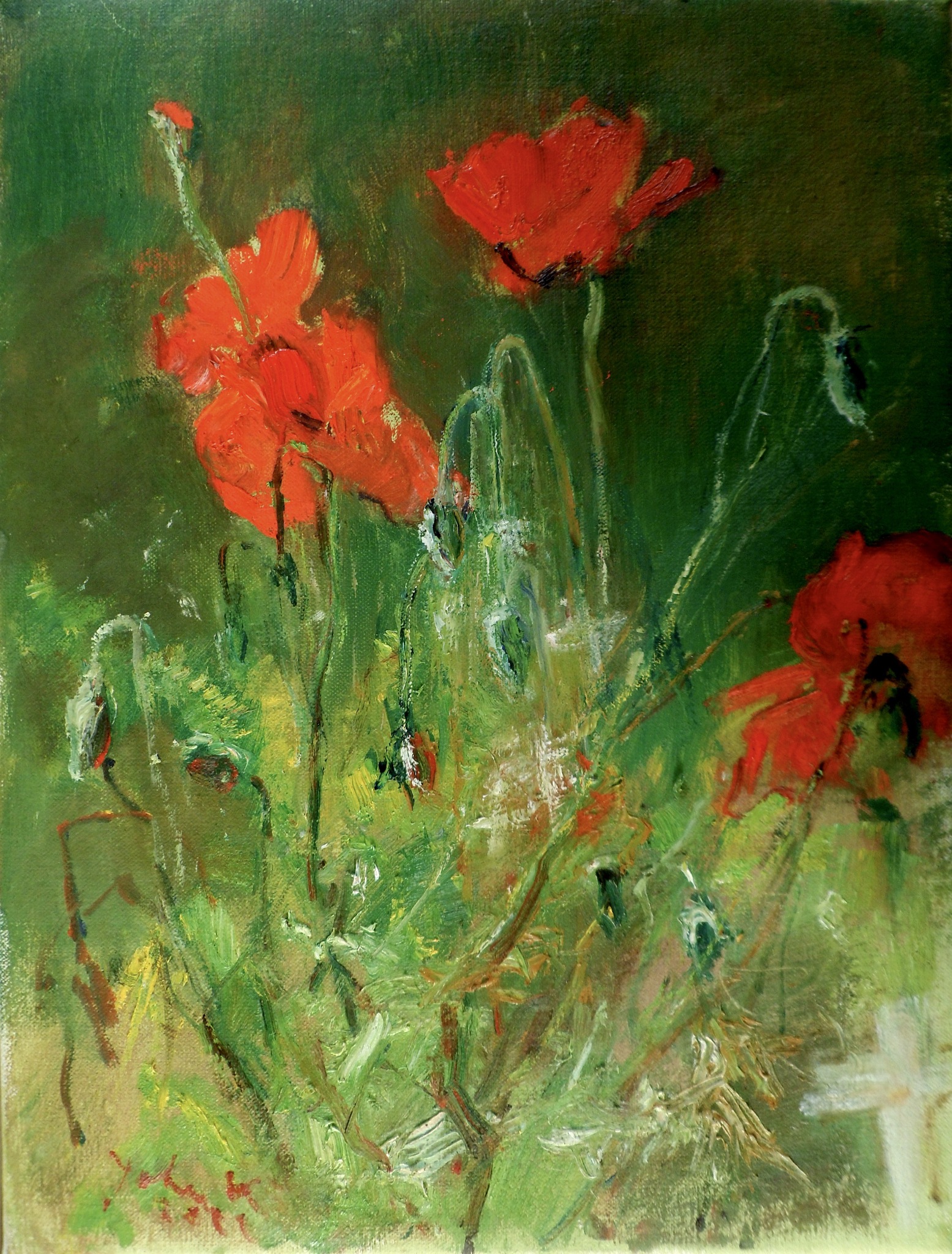 Dit schilderij maakte ik speciaal voor een tentoonstelling met als motto Zinnebeelden. Ik koos de papaver en omschreef dit als volgt: Het zaad van de papaver kan zo diep in de aarde terecht komen dat het niet kan ontkiemen. In de Eerste Wereldoorlog werd de grond op de slagvelden omgewoeld waardoor het zaad naar boven kon komen en de bloemen de velden rood kleurden. Zo werd de papaver, in de negentiende eeuw symbool van vreugde, nu symbool van vergoten bloed.