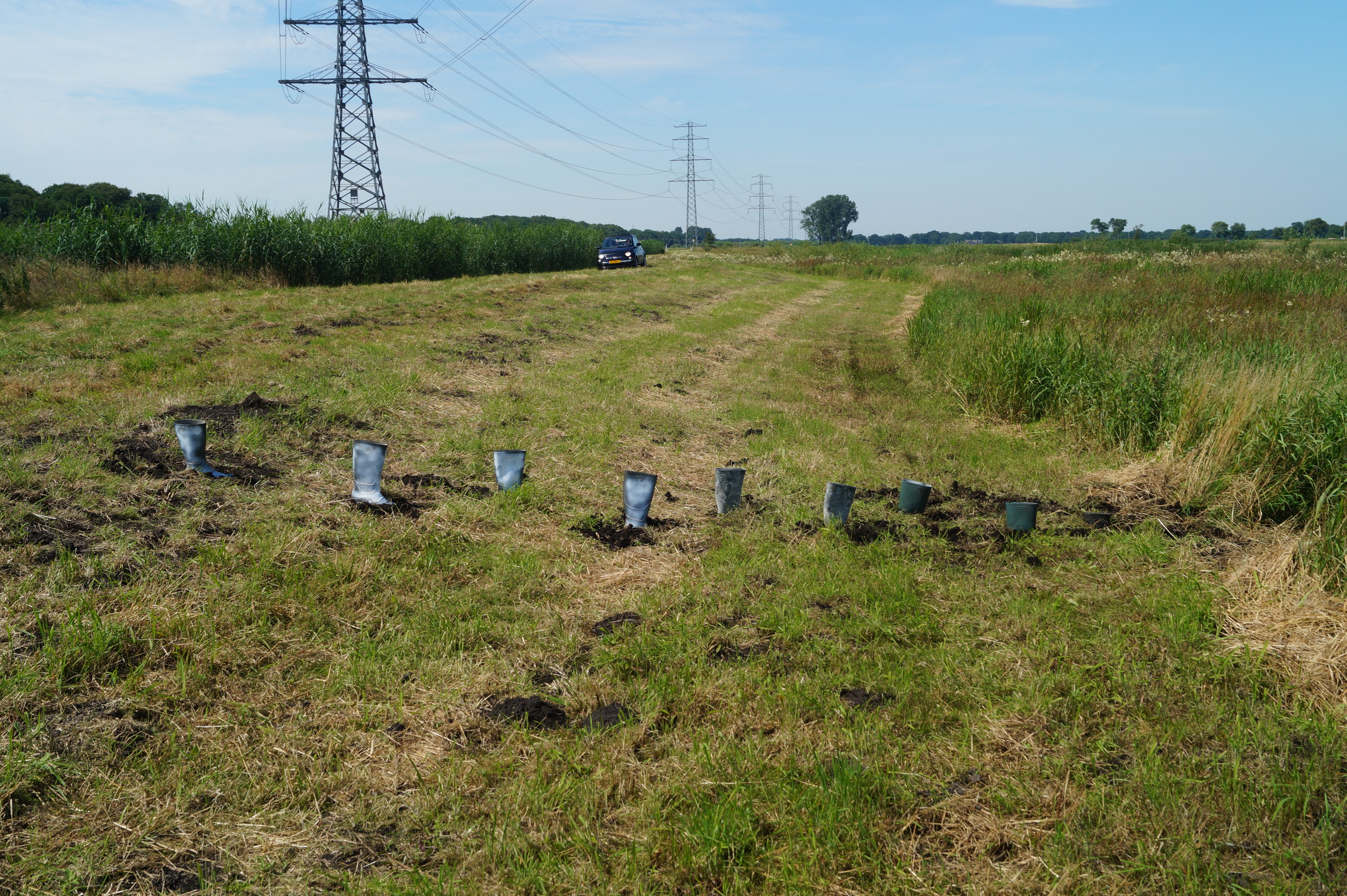 Rij van laarzen die alsmaar wegzakken bij het benaderen van het vennetje