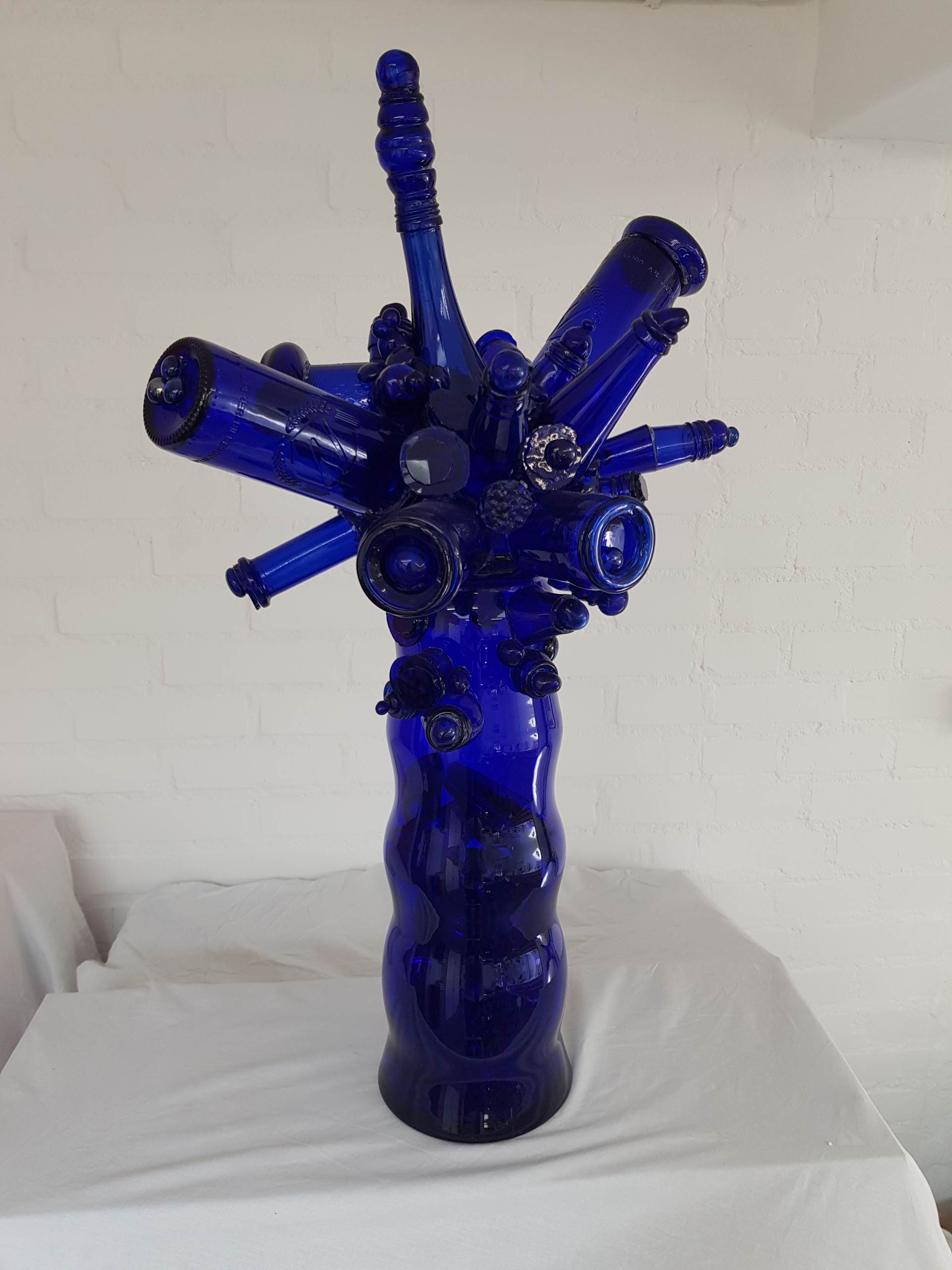 Knotwilgen hebben mij altijd gefascineerd. De overlevingskracht, na elke snoei groeit hij steeds opnieuw uit en wordt gaandeweg steeds interessanter. Met deze blauwe knotwilg wil ik uitdrukking geven aan de worsteling van de natuur die nu onder druk staat. De natuur heeft momenteel "the blues" het gaat immers niet goed. Tijd voor aandacht en inzet van ons allemaal.