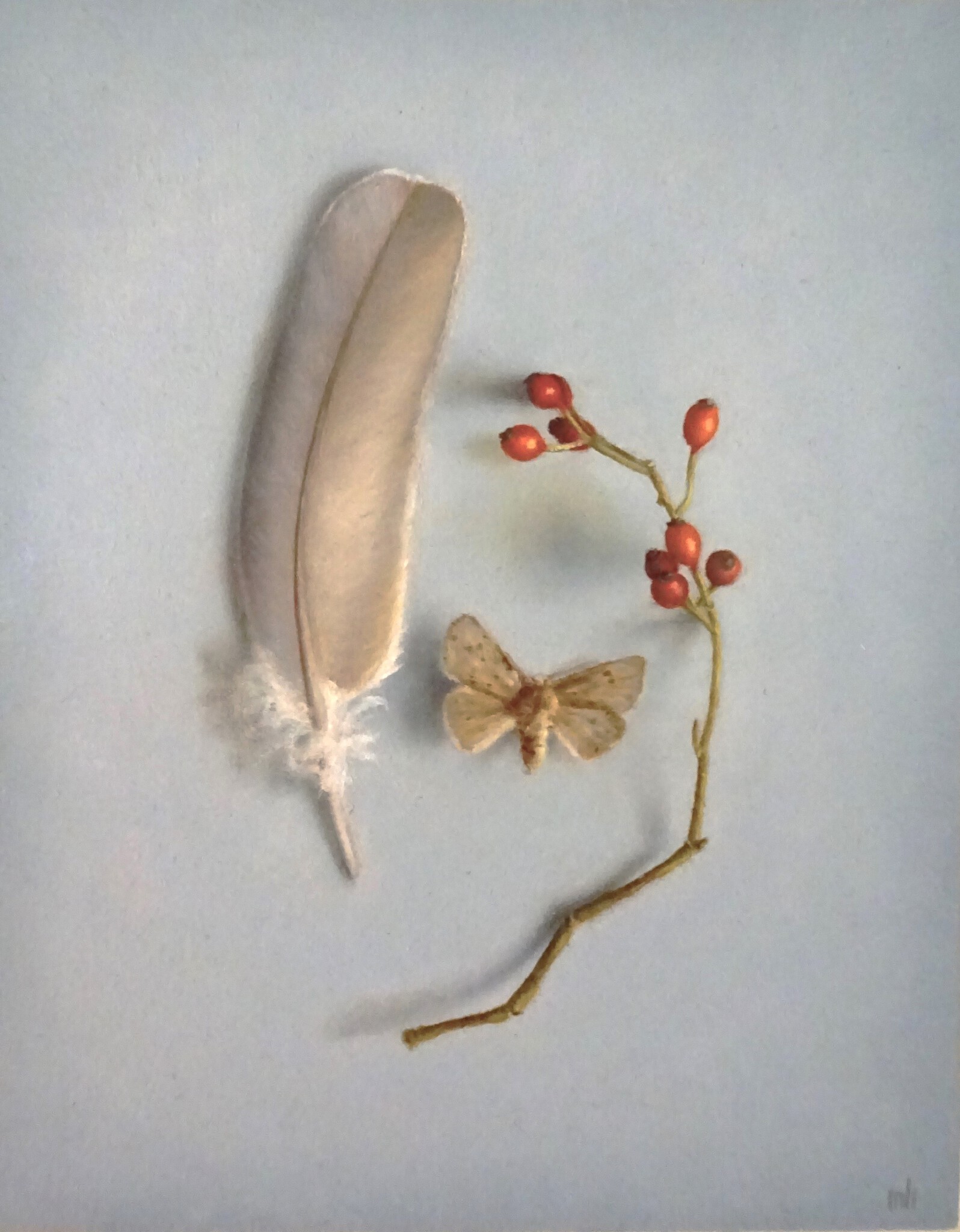 Realistisch Olieverf Stilleven Veer Mot Rozenbotteltjes