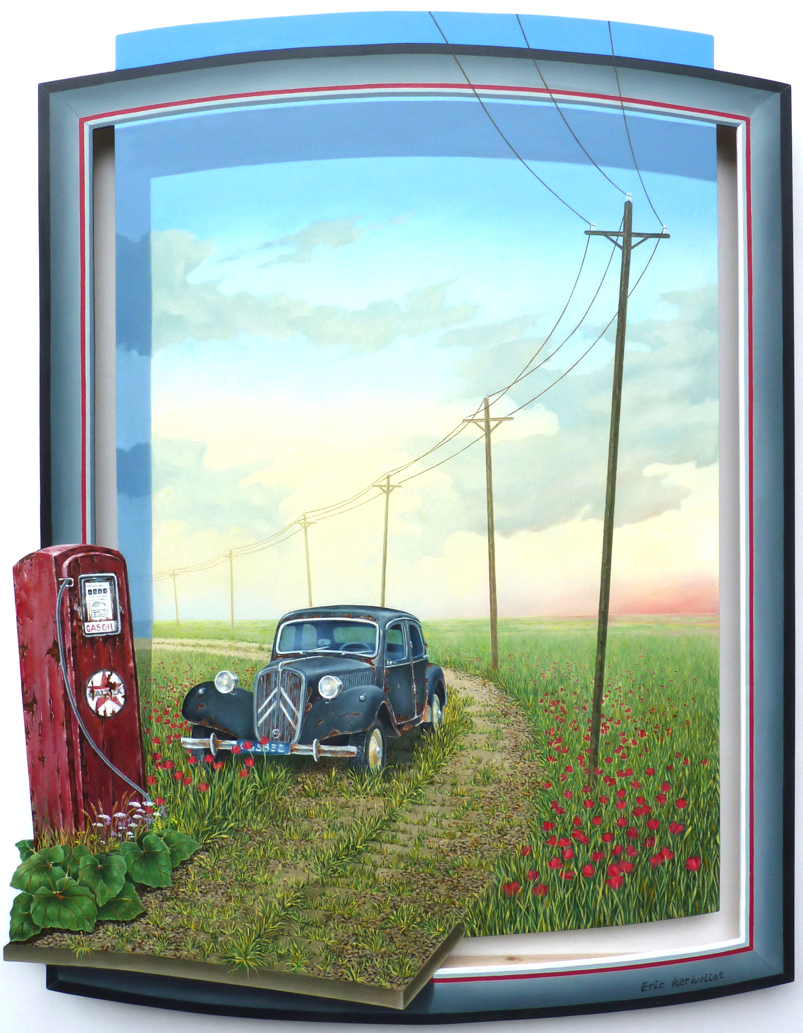 Eric Kerkvliet schildert met olieverf uiterst gedetailleerd voorstellingen op iets verhoogd paneel waardoor bij juiste belichting een Trompe-l’oeil-achtig effect ontstaat.