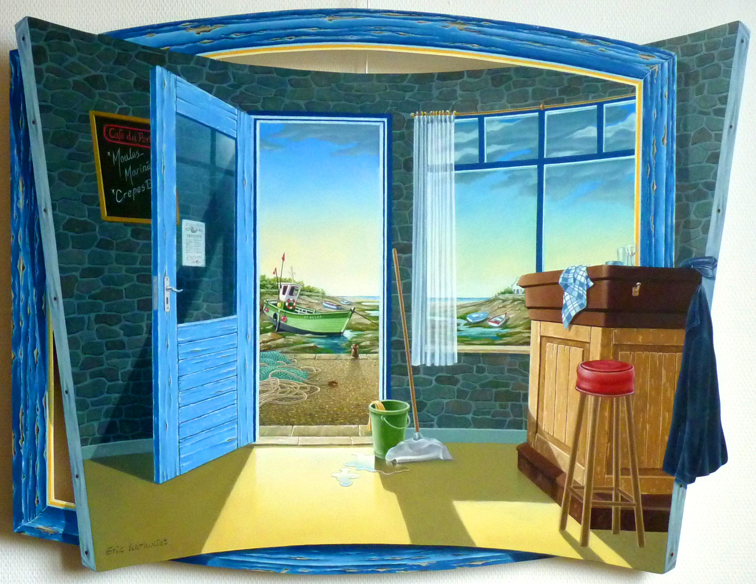 Eric Kerkvliet schildert met olieverf uiterst gedetailleerd voorstellingen op iets verhoogd paneel waardoor bij juiste belichting een Trompe-l’oeil-achtig effect ontstaat.