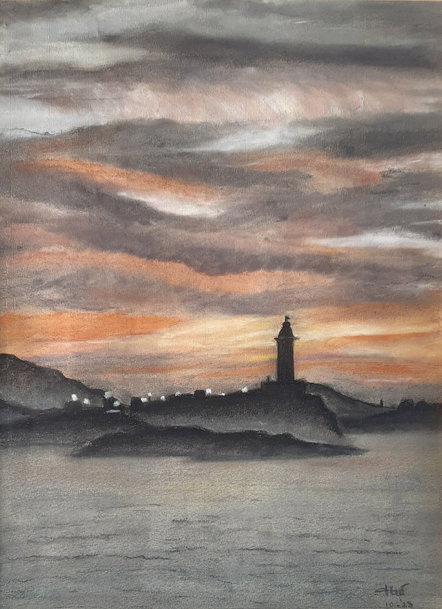 Pasteltekening van de Herculestoren van A Caruña bij zonsondergang. Het spelen met licht en reflectie vind ik heerlijk.