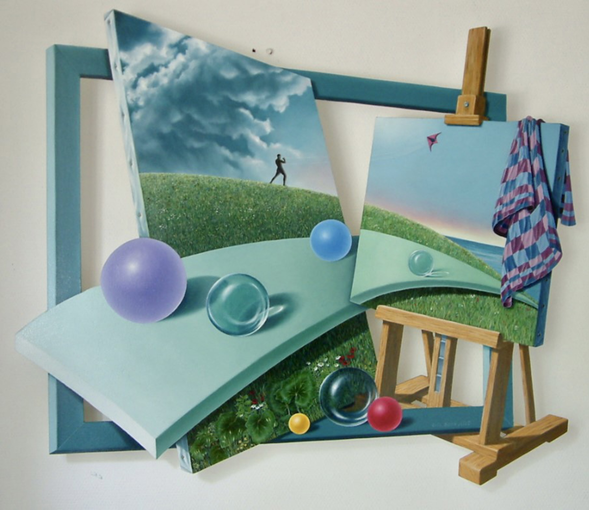 Eric Kerkvliet schildert met olieverf uiterst gedetailleerd voorstellingen op iets verhoogd paneel waardoor bij juiste belichting een Trompe-l’oeil-achtig effect ontstaat.