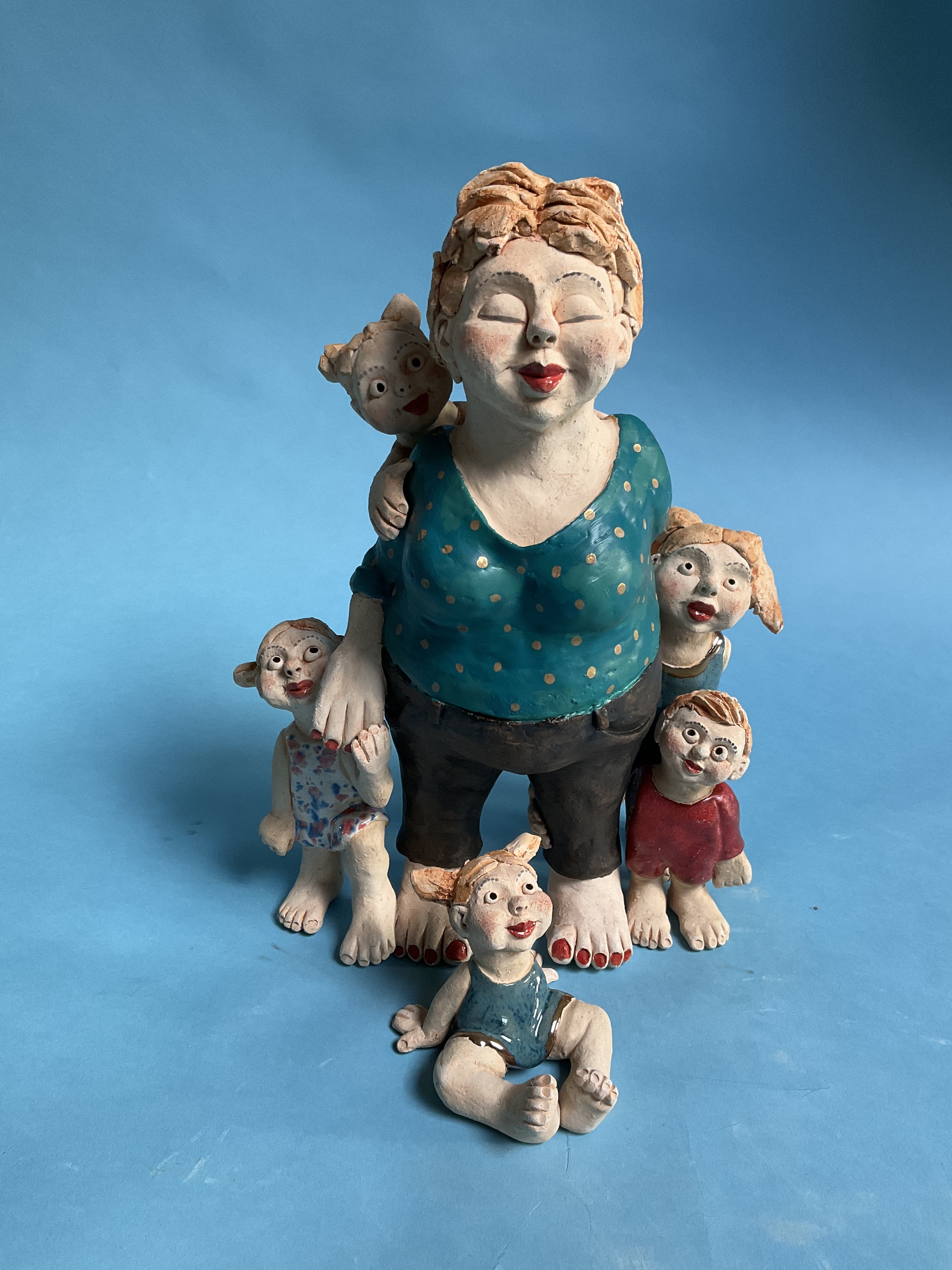 Beeld in opdracht. Oma met 5 kleinkinderen. Keramiek afgewerkt met glanzende en matte glazuur.