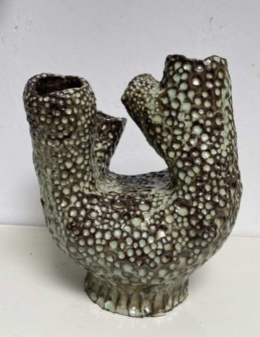 Een vaas op koraal geinspireerd ,gemaakt van zwart bakkende klei en een celadon glazuur.
