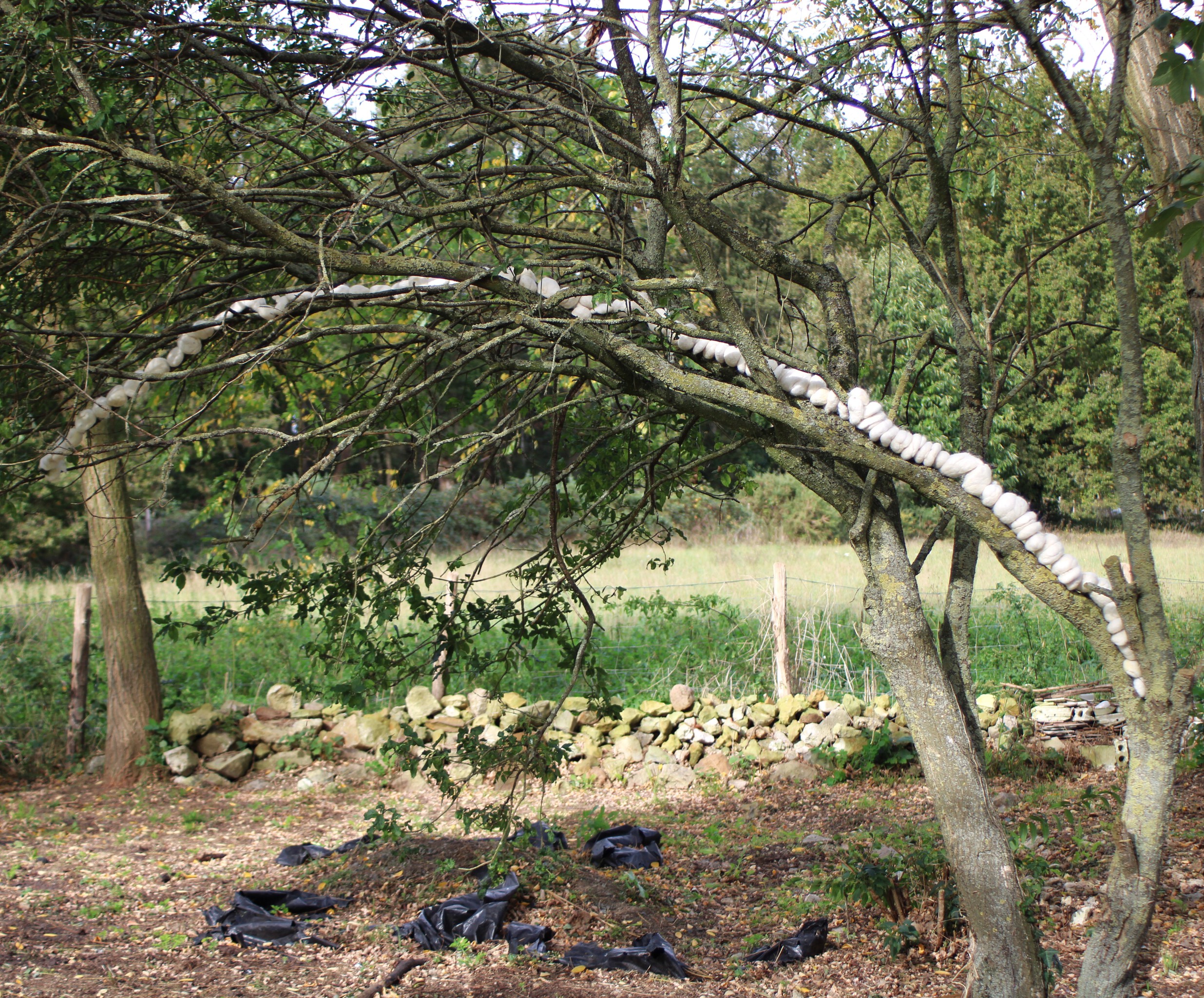 Tijdens mijn werkverblijf in La Sarthe FR in 2023 zag deze in-situ installatie het levenslicht: "Pas doux Chemins tenaces" (in het Nederlands: Zachte stappen Stugge paden). Een struik van de kardinaalsmuts, wijkend voor een esdoorn en een es die er vlakbij staan. Over de gebogen, wijkende tak kruipt een spoor van zachte wollen vormpjes, op weg naar het uiteinde. Zachte stapjes makend over stuggen paden. Bekijk vooral ook de video, die geeft een beter beeld van dit werk dan alleen de foto.