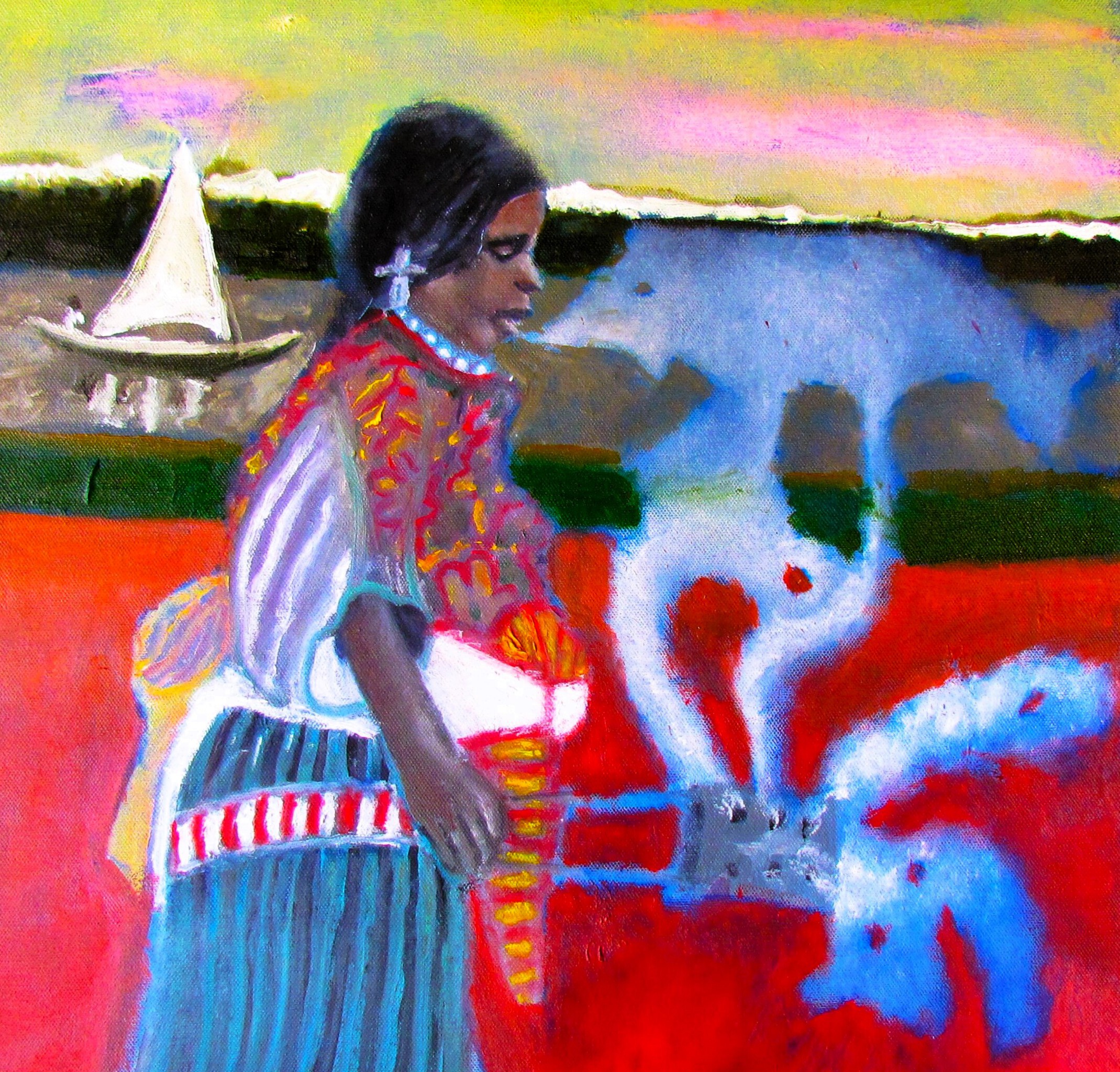 Wierookwind Zij wiegt het vat in rookgloed zacht, een Maya-vrouw in avondwacht. De zon zinkt traag in vuur en goud, haar schaduw danst op aarde oud. Een zeil keert terug — de visser vaart, langs water dat geheimen spaart. De rivier fluistert in ademstilte, waar wierook stijgt en licht zich hult in stilte.
