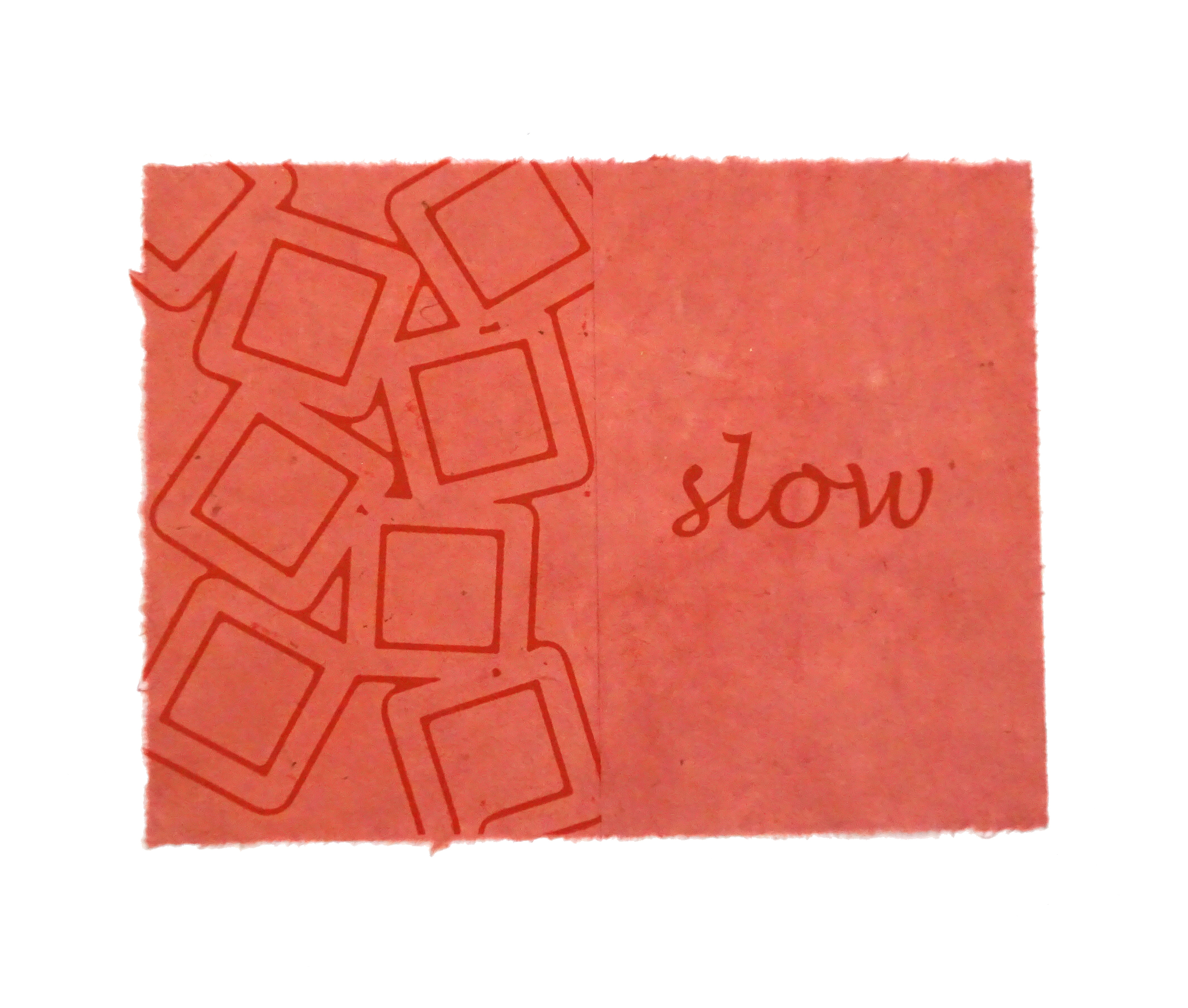 Vlakdruk op gekleurd Himalayapapier. Slow Motion is een boekenserie in wording. Het bladeren door een boek is een andere en langzamere manier van kijken.