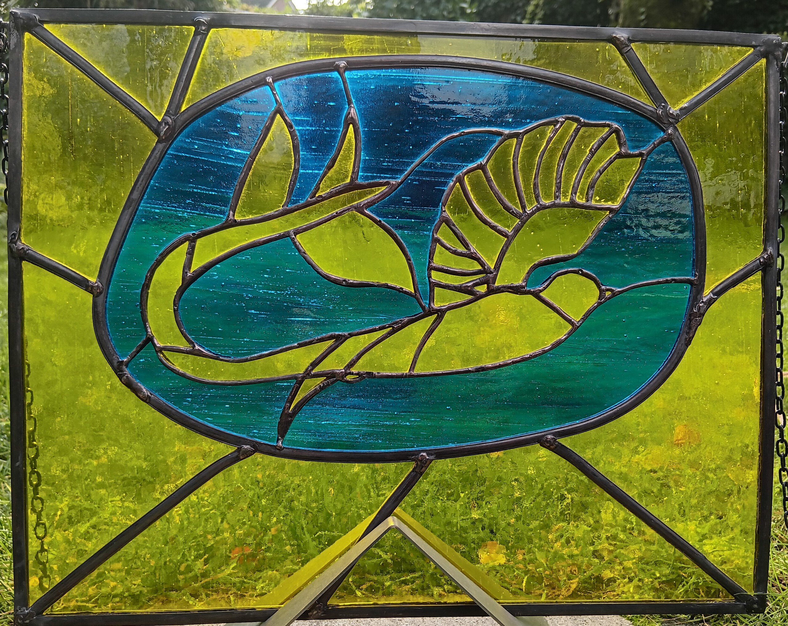 De quetzal is een prachtige, kleurrijke vogel (en de nationale vogel van Guatamala) die voorkomt in Zuid-Amerika. Het is ook het logo van een prachtig startend bedrijf dat lokaal kopmbucha brouwt. Wat is er mooier om dit te vieren en in het raam van de brouwerij te hangen dan een quetzal-bruid in de bedrijfskleuren en gevormd uit tifffany met een beetje glas in lood - prachtig.