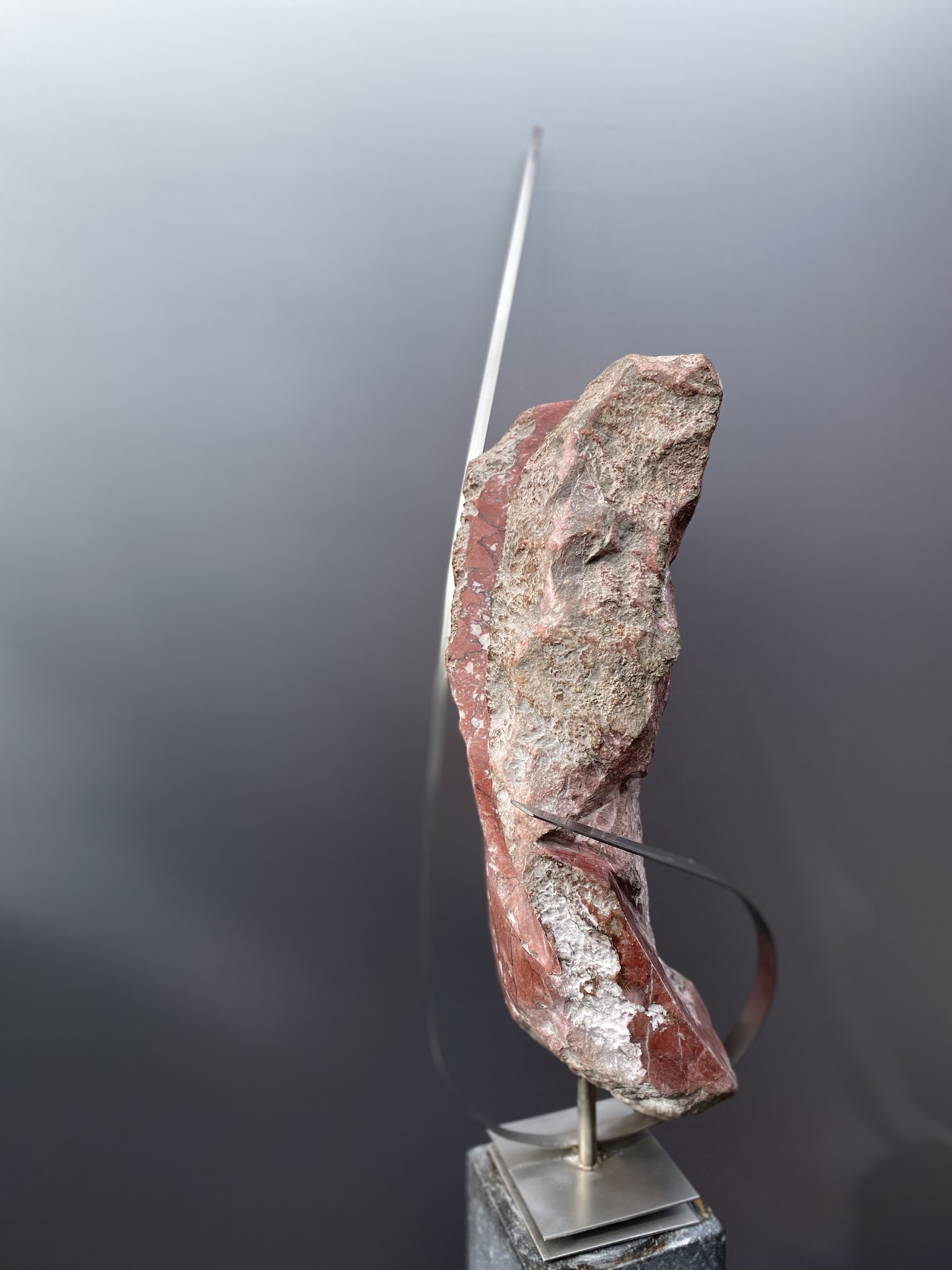 Hans van Uden werkt met harde natuursteen waarbij het een deel van de oorspronkelijke steen laat bestaan . Daarnaast combineert hij steen met Kortenstaal