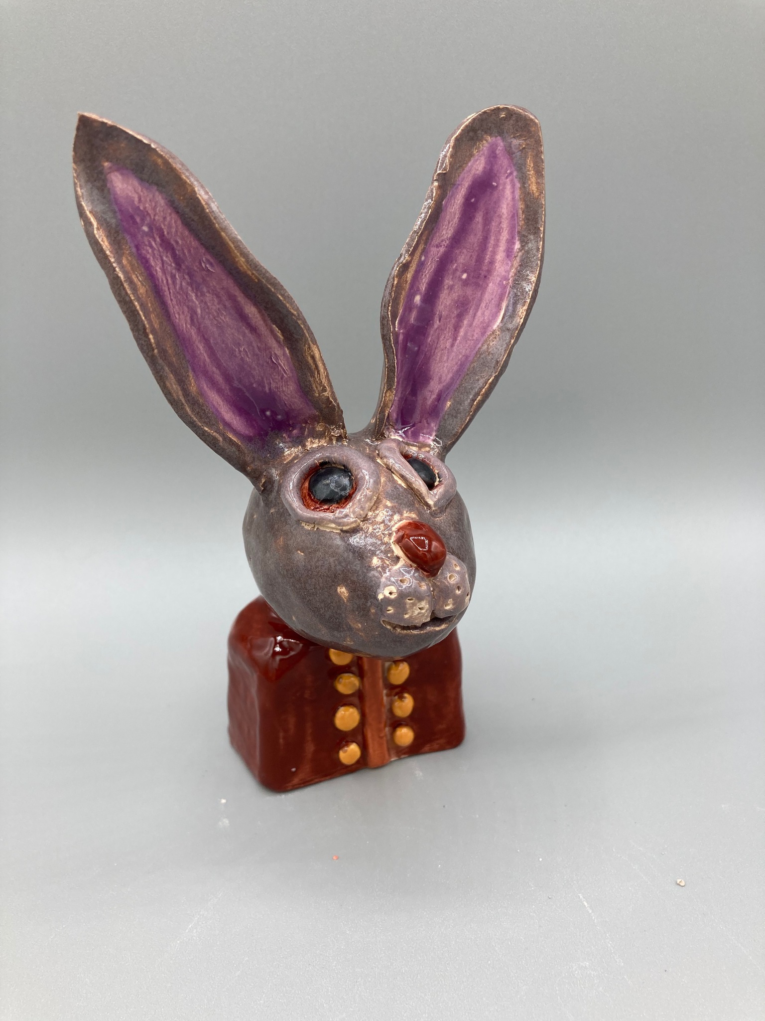 Buste van een haas a la Lisa Naples met een bruin hemd aan met gele knopen