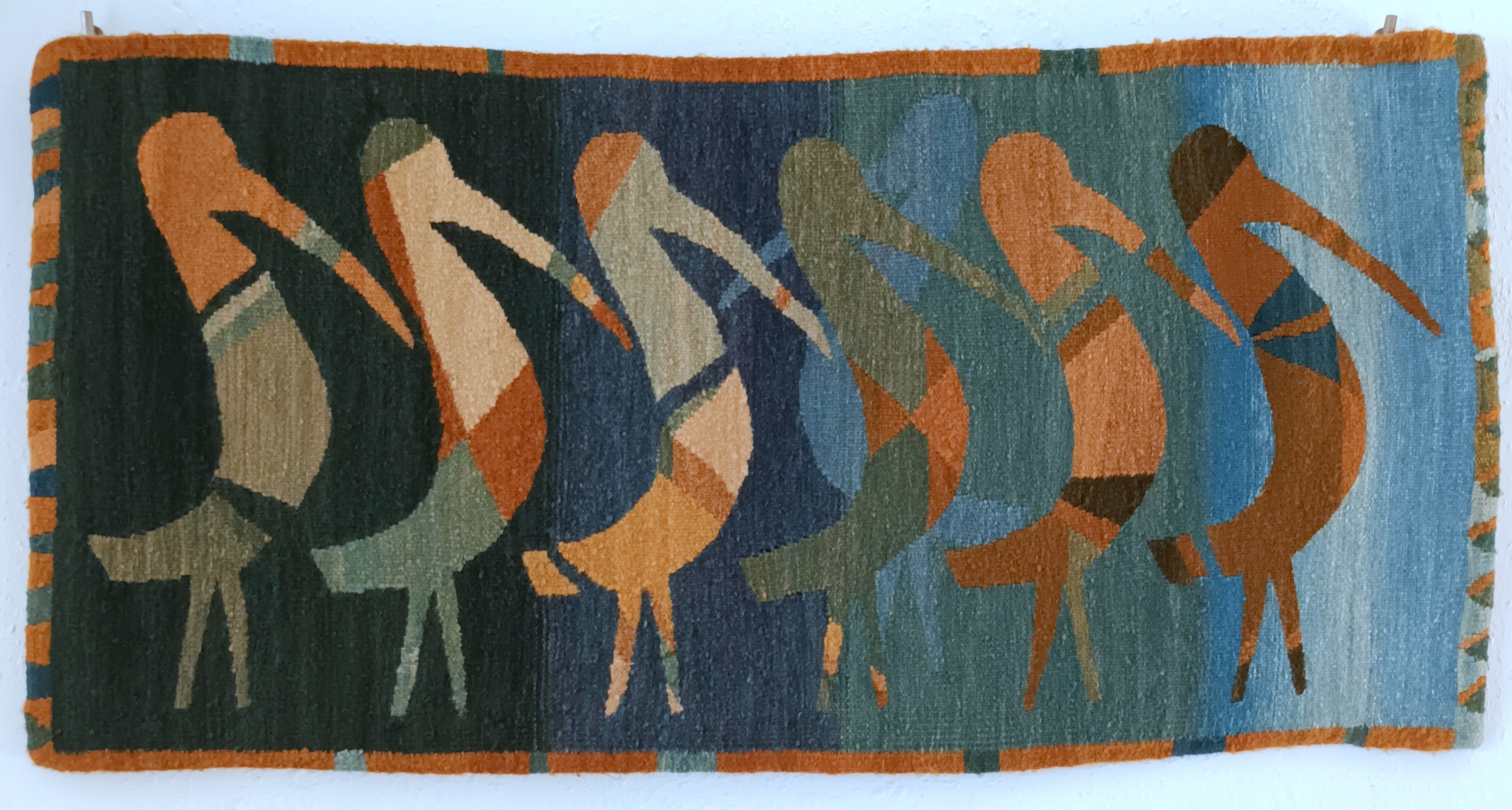 Mijn wandkleden worden gemaakt van schapenwol die ik zelf spin, waarna ik deze verf met plantaardige materialen , zoals indigo, meekrap en fustic. De techniek is inlegwerk op 2 schachten.