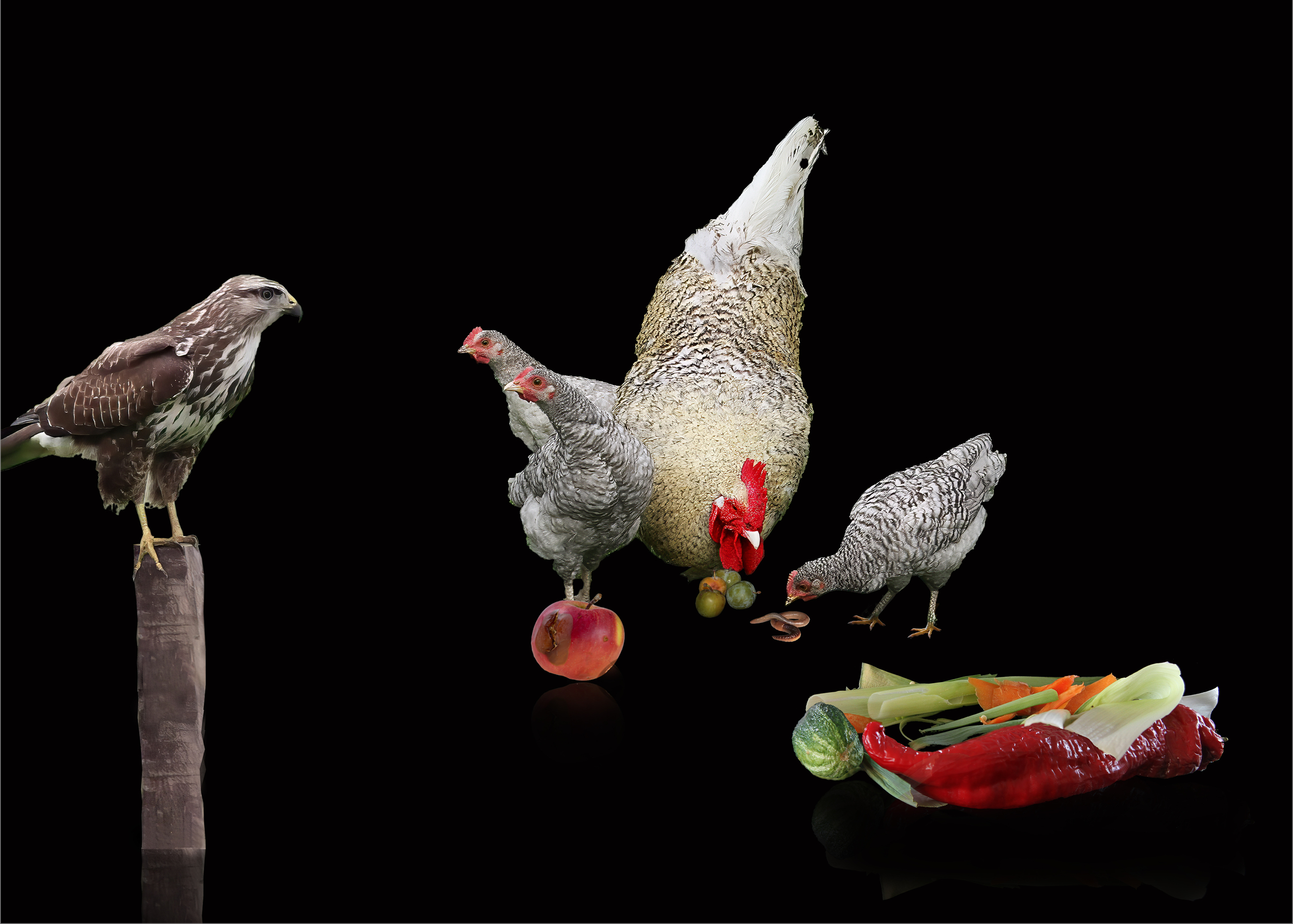 kippen aan de scharrel, met groente afval en zorgvuldig gadegeslagen door een buizerd. Een fatasie. Nadat deze foto gemaakt was, bleek dat de twee keukens inderdaad door een buizerd waren verorberd. De foto heeft een formaat van 70 x 50 cm en is opgeplakt op forex board en voorzien van een ophangmogelijkheid.