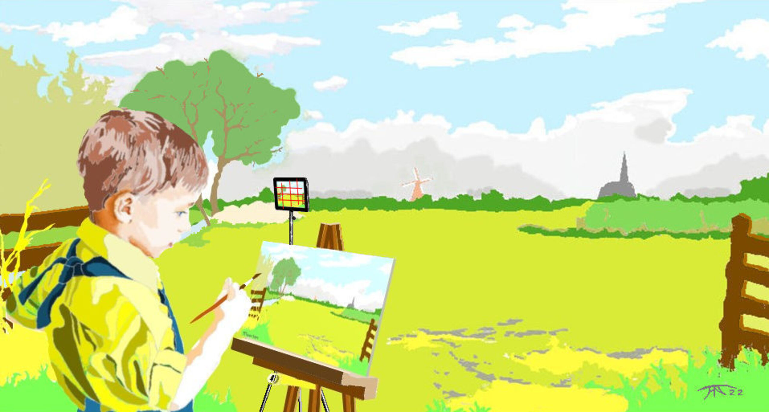 In het kinderboek doet maarten voor hoe je buiten schildert. Het is een computer tekening.